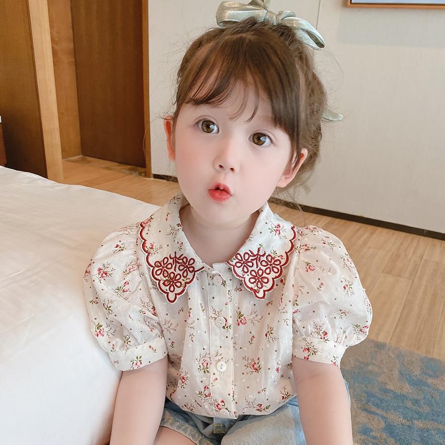 2-7 Years Baby Girls Sloral Shirt Cotton Blouse for Girl Short Sleeve Baby Clothes Summer Clothes Pink White Tops Vintage