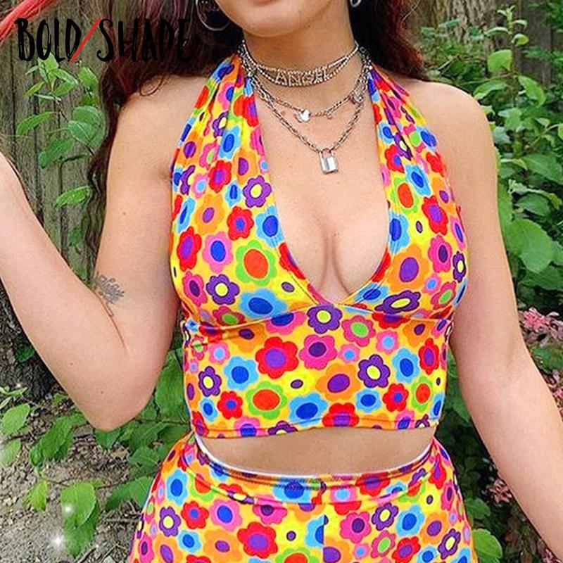 Bold Shade 2000s Aesthetic Floral Print Tops Sleeveless Indie V-Neck Sexy Criss Cross Halter Tops E-girl Style Summer Vest 2021