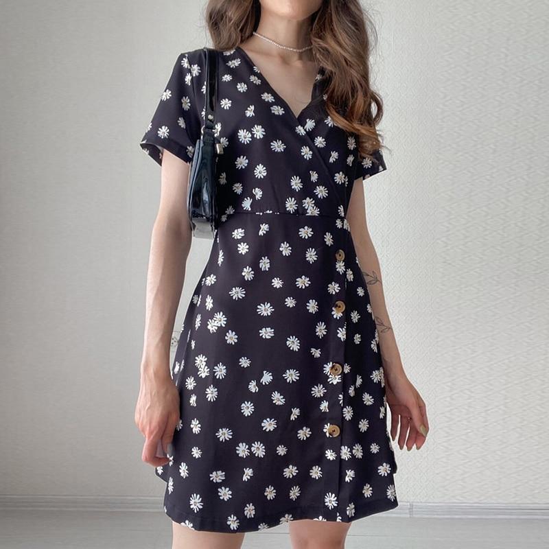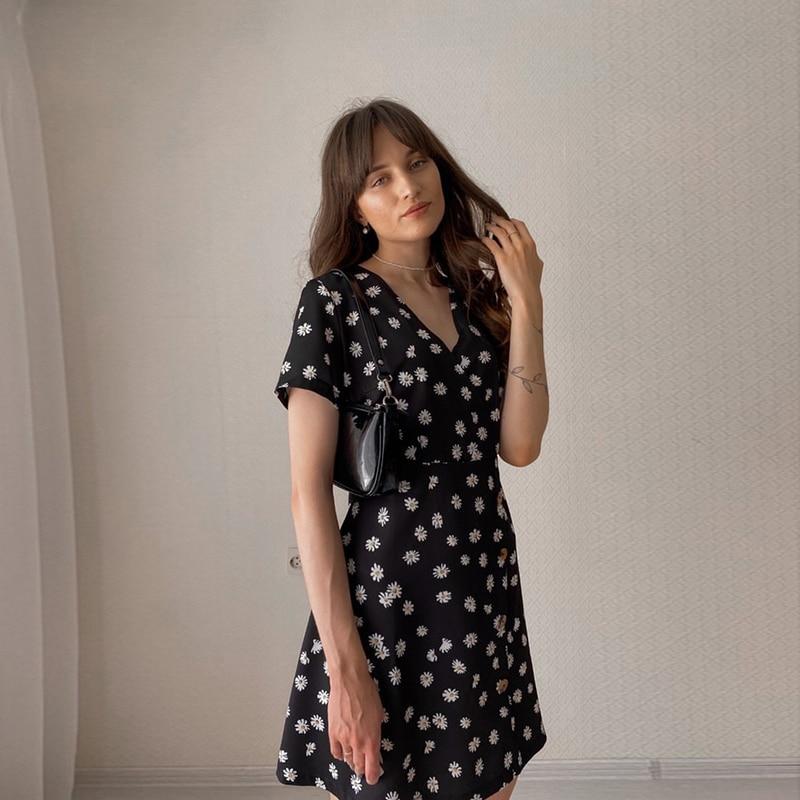 CHURSES Women Casual A-line Print V-neck Button Short Sleeve Mini Dress Black 2021 New Fashion Summer Sexy Dress