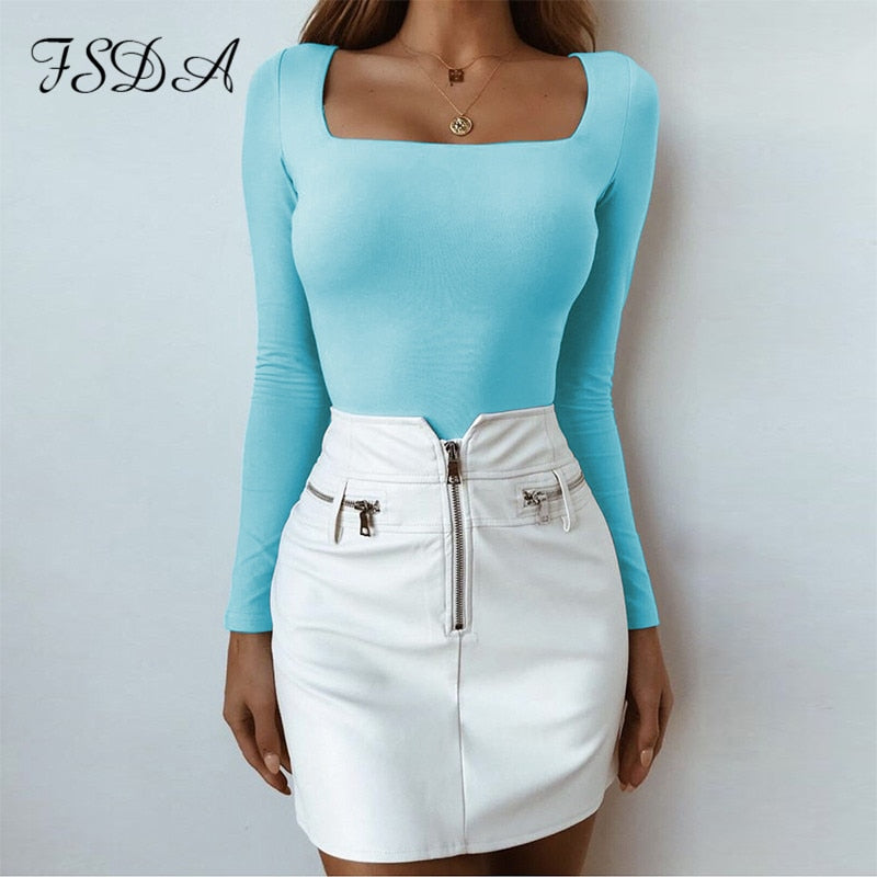 FSDA Suqare Neck Casual Long Sleeve T Shirt Women Sexy Top Black White Autumn Spring Summer Red Tee Basic Ladies Shirt Top