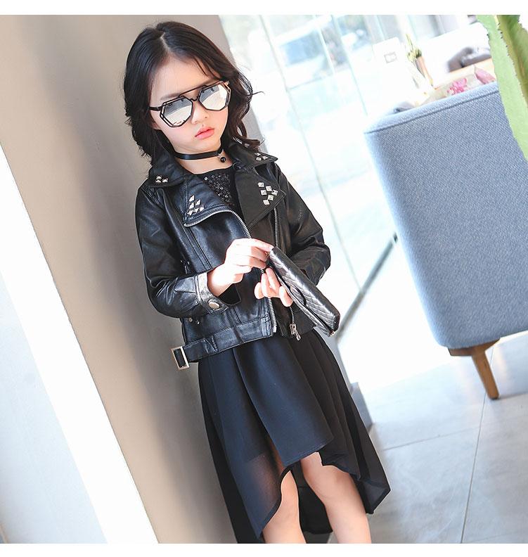 girls spring autumn jacket 2-7 years old fashion PU jacket lapel coat Metal rivets motorcycle leather belt kids jackets