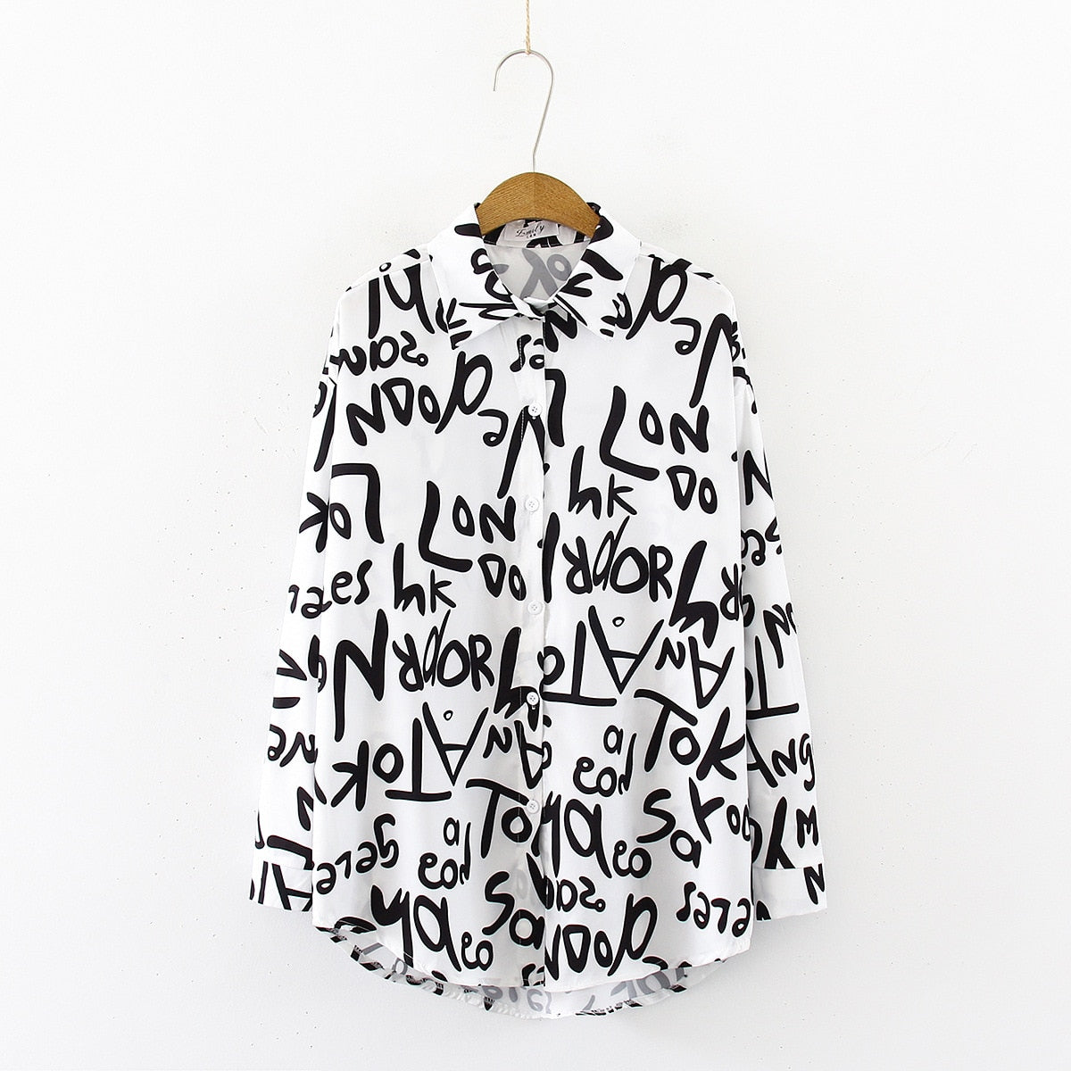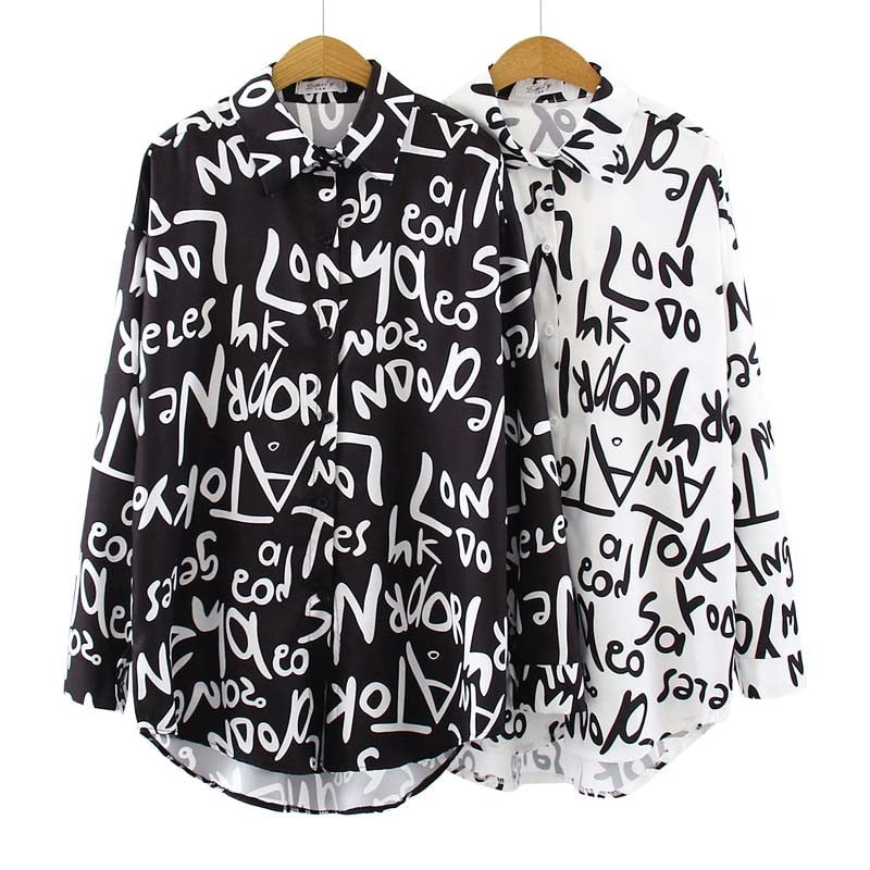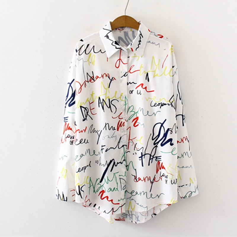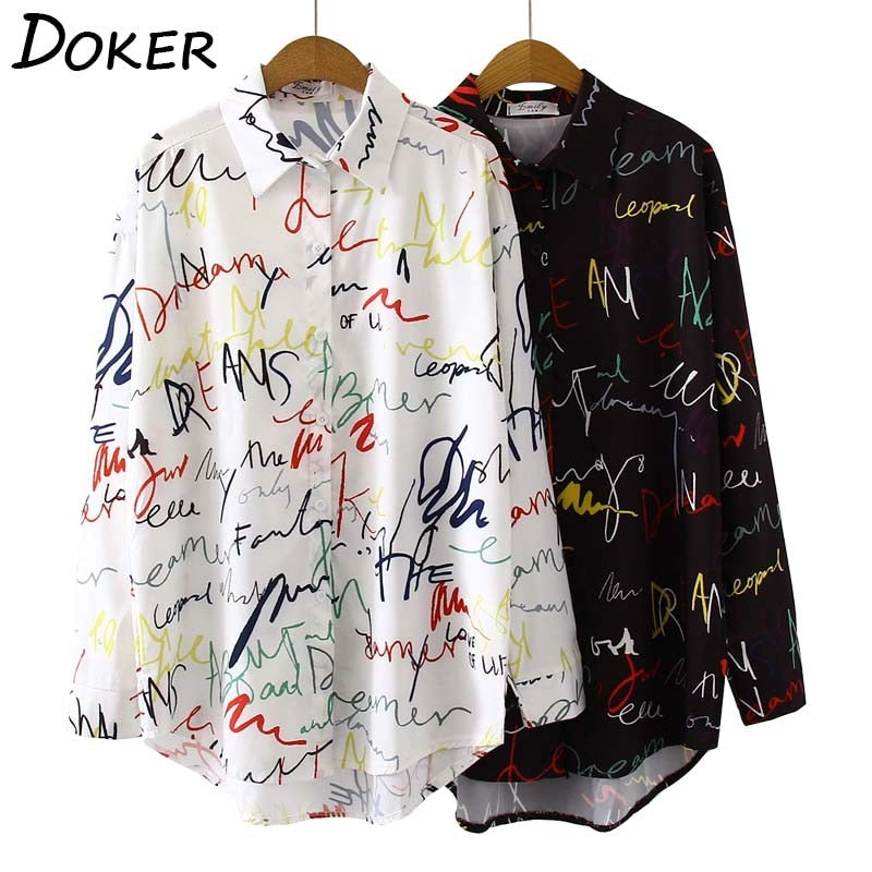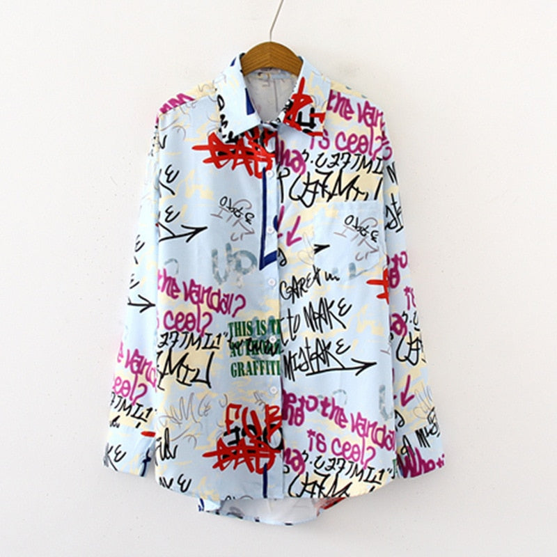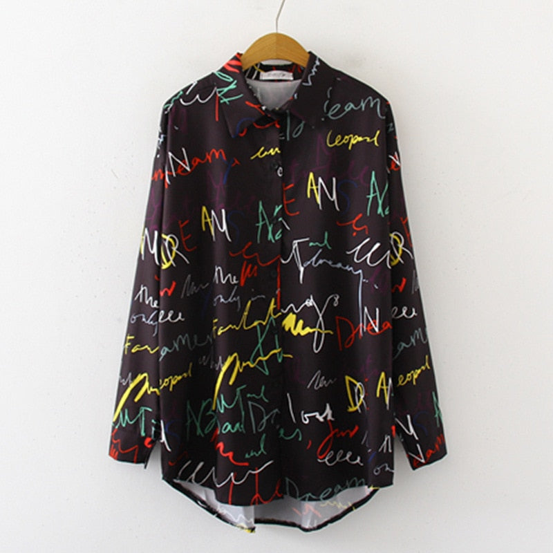 Graffiti Print Blouse Women Autumn Turn-down Collar Long Sleeve Plus Size Office Elegant Ladies Shirts Casual Tops And Blouses