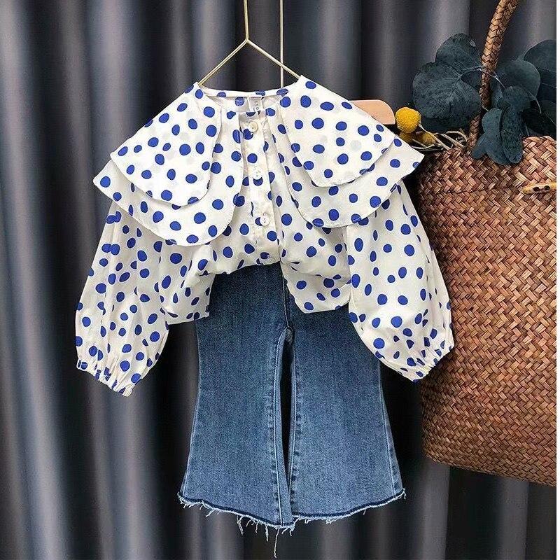 New Fashion Girls Clothing Sets Cotton Children Tops Denim pants 2 pcs Kids Round Neck Polka Dot Suits Baby Casual Outfit