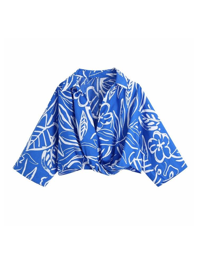 PUWD Oversize Women V Neck Blouse 2021 Summer Fashion Ladies High Street Loose Shirt Female Blue Printed Short Shirt Top