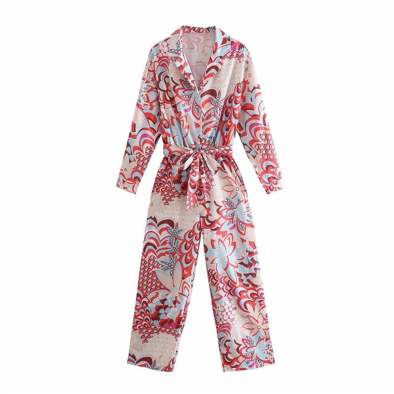 PUWD Vintage Woman Red Print Sashes Jumpsuits 2021 Spring Casual Female High Waisted Jumpsuit Ladies Floral Beach Rompers