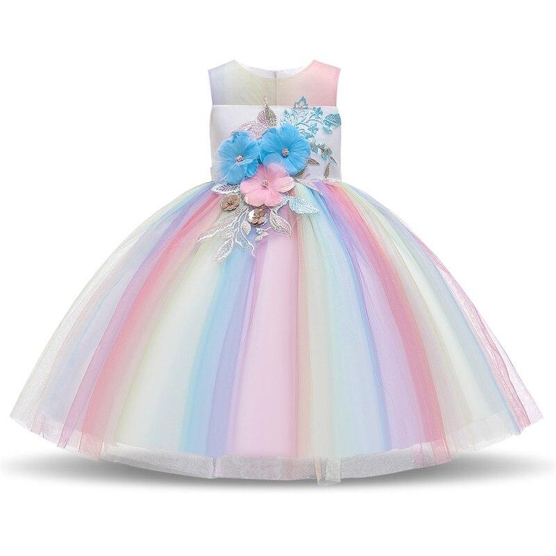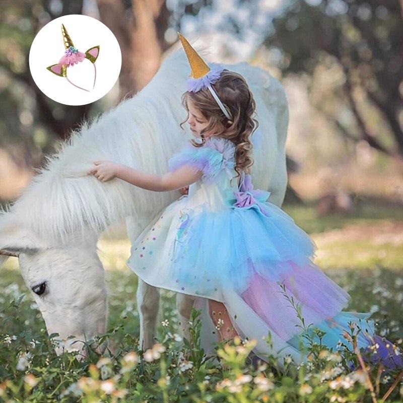 Rainbow Cake Girls Unicorn Dress Long Tail Train Dress Baby Girl Princess Birthday Party Ball Gown Kids Horse Clothes Hairband