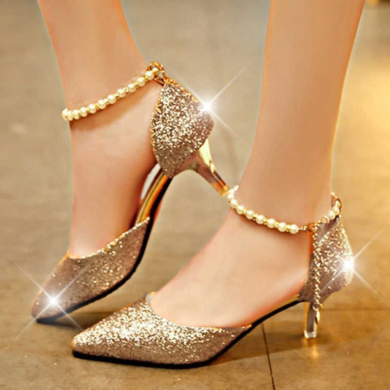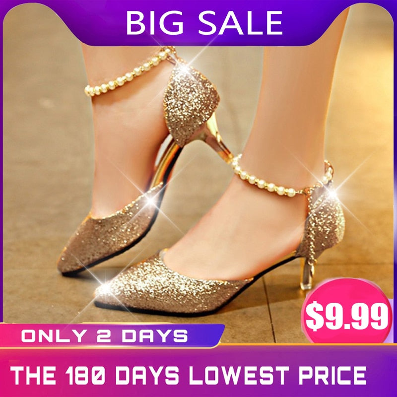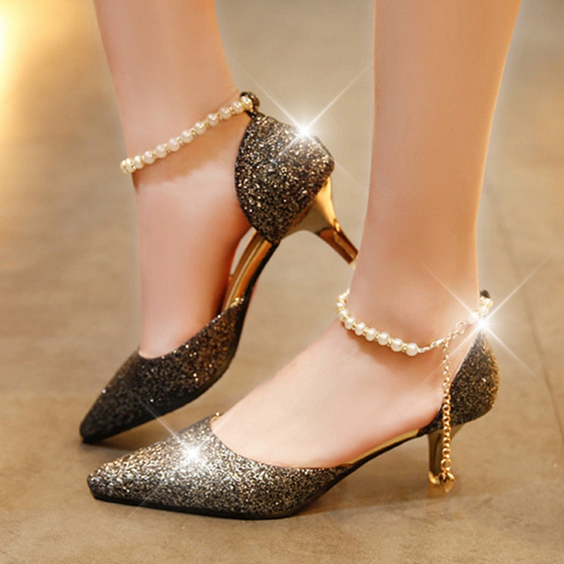 Sexy Pointed Toe Pearl High Heels Shoes Female Fashion Hollow with Sandals Paillette of The Thin Breathable Shoes Women Pumps