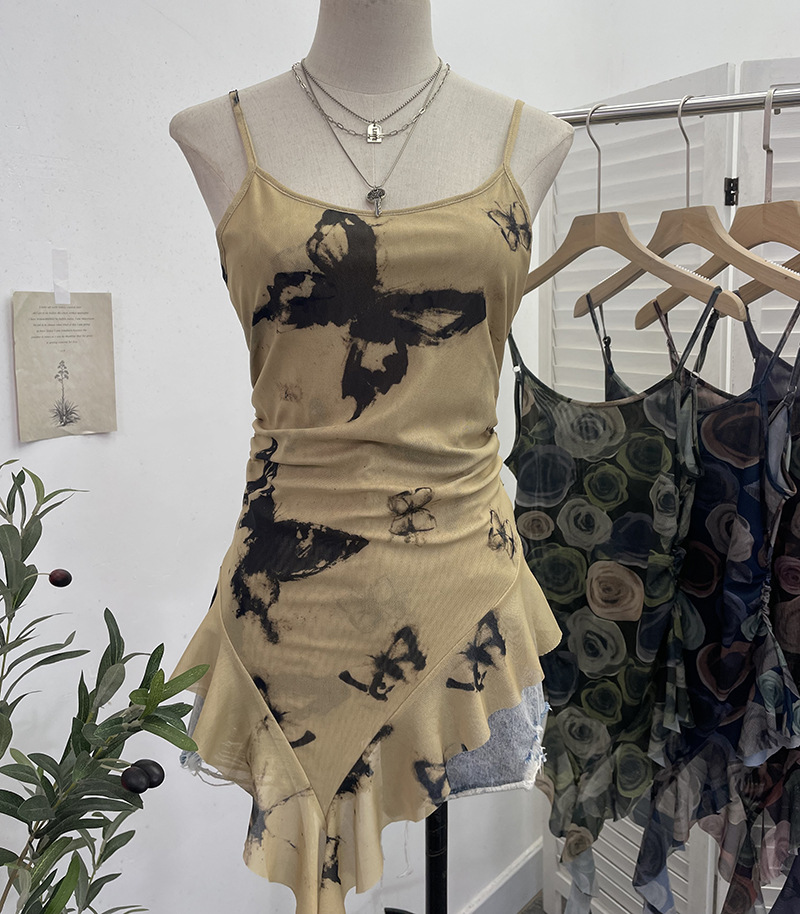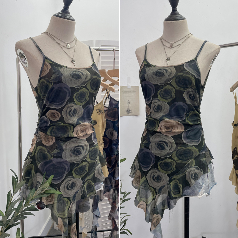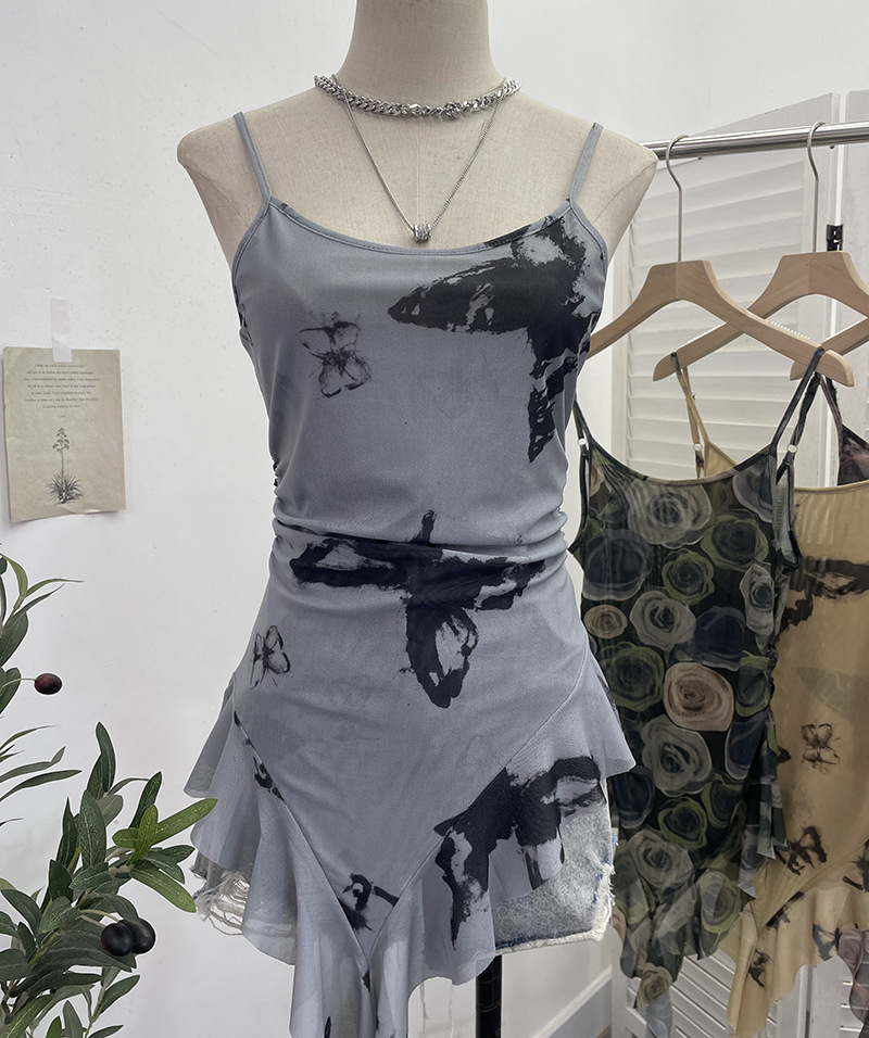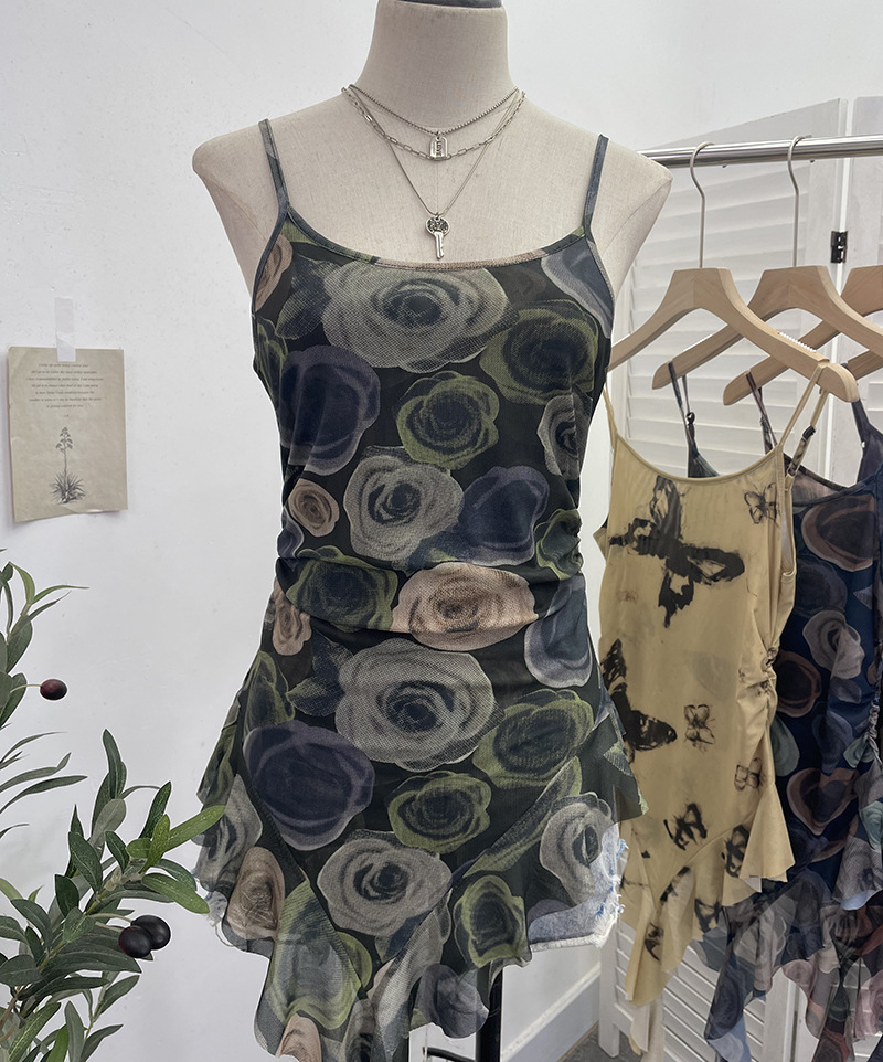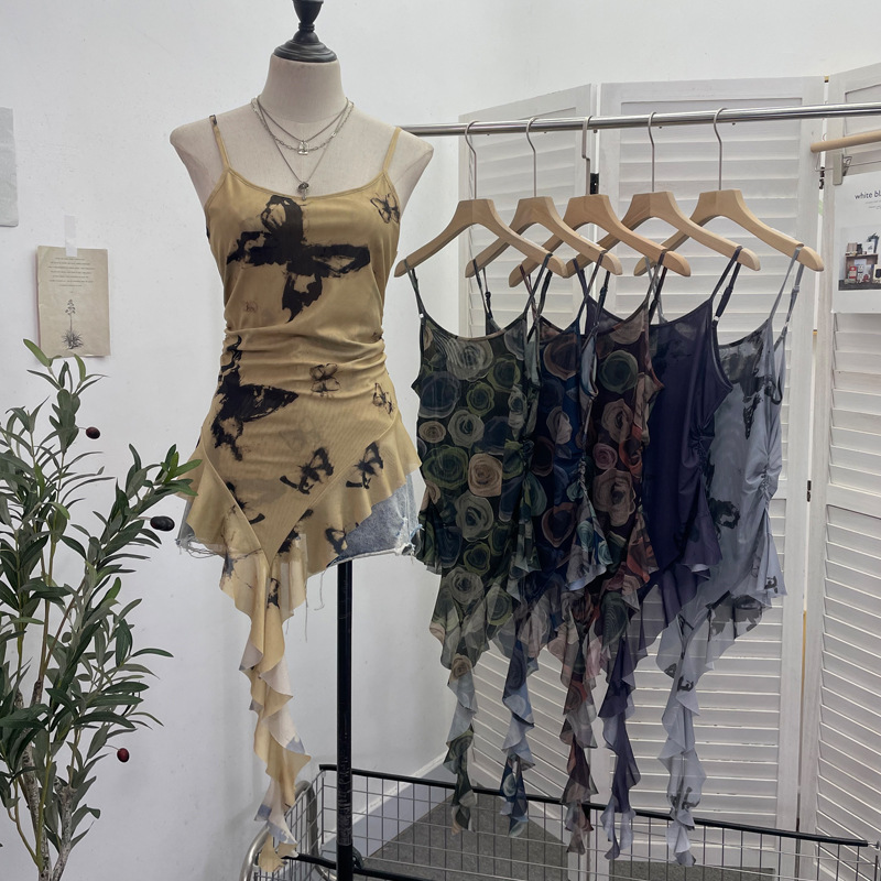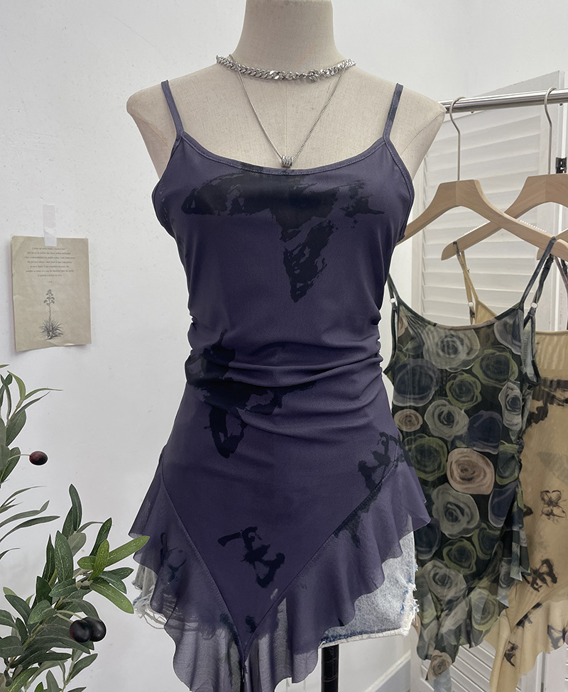 Uveng 辣bab Net Yarn Print Small Sling Vest Tidly Tidly Ribbon Ribbon Leaves Edge Sleeveless Top 9970