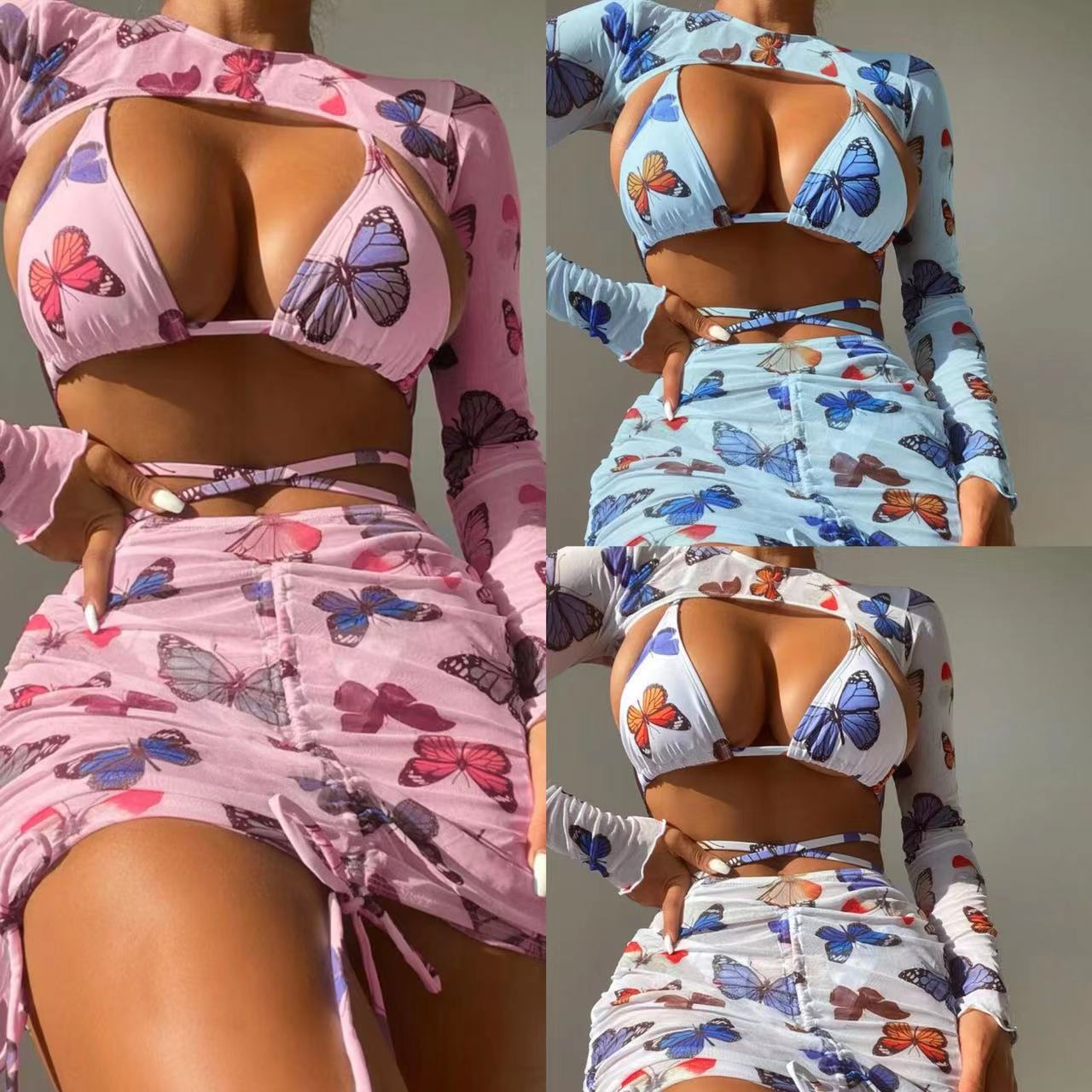 Uveng 2023 New Butterfly Print Drawstring Strap Sexy Four-Piece Swimsuit Bikini