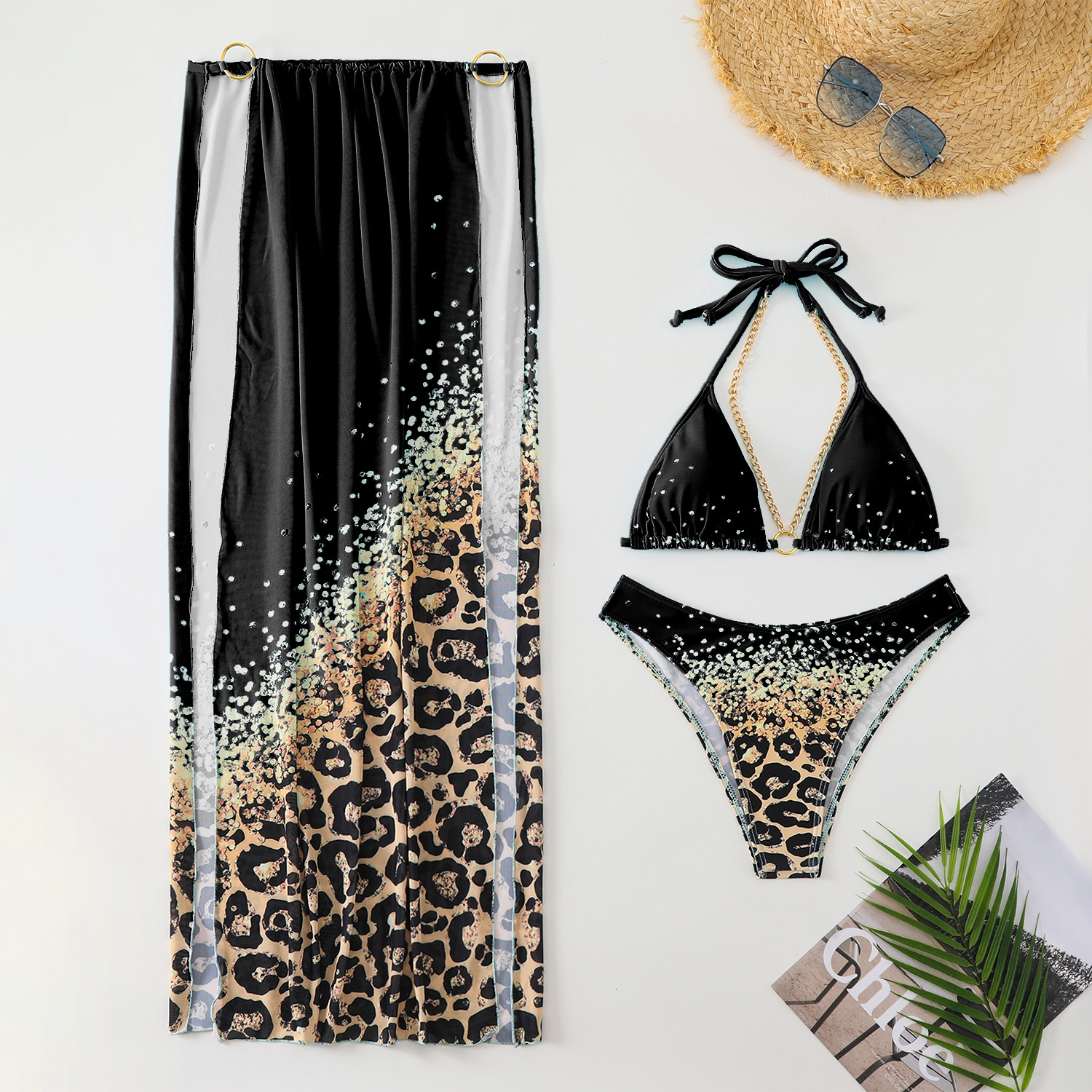 Uveng 2024 New Fixed-Print Leopard Print Three-Piece Mesh Dress Bikini