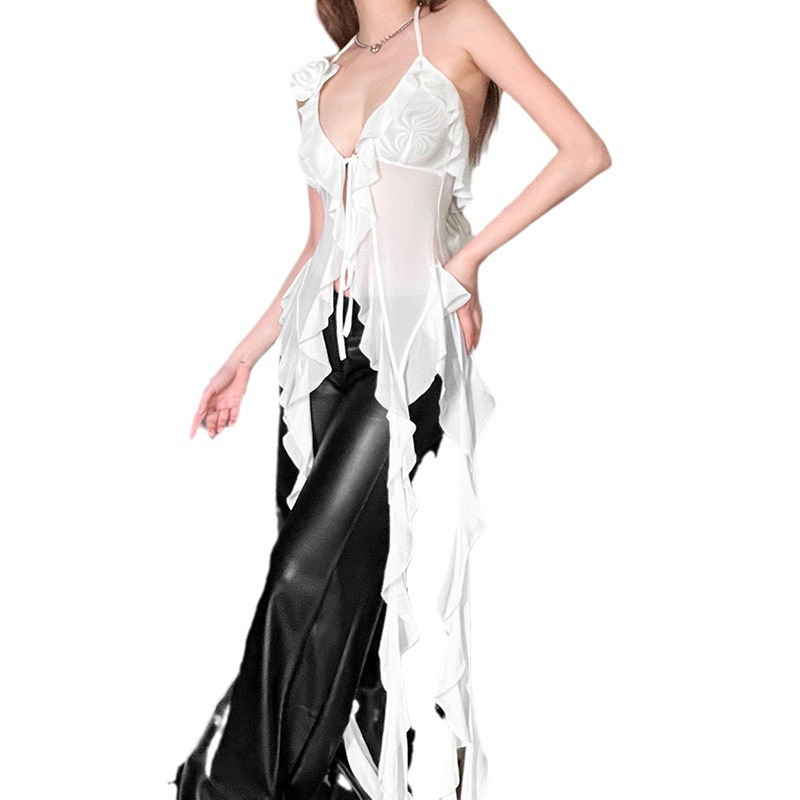 Uveng 2024 Summer New Women's Clothing Hanging Neck Sexy Bare Back Strap Yarn Mesh Repair Solid Color Small Vest