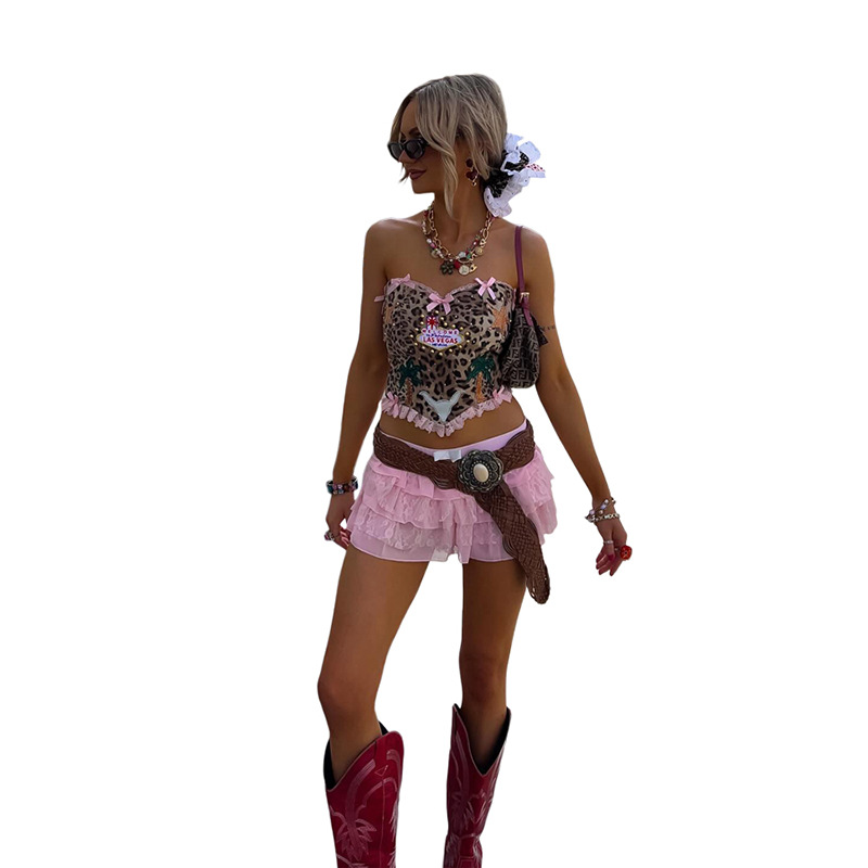 Uveng 2024 Summer New Women's Fresh Sweet Bow Leopard Dew Back Repair Vest