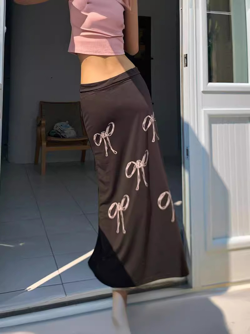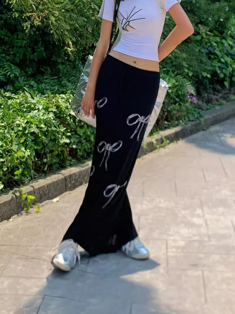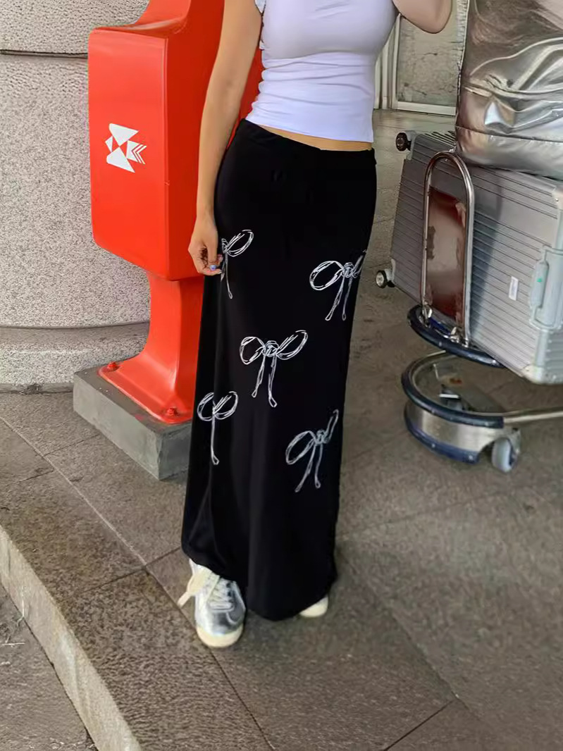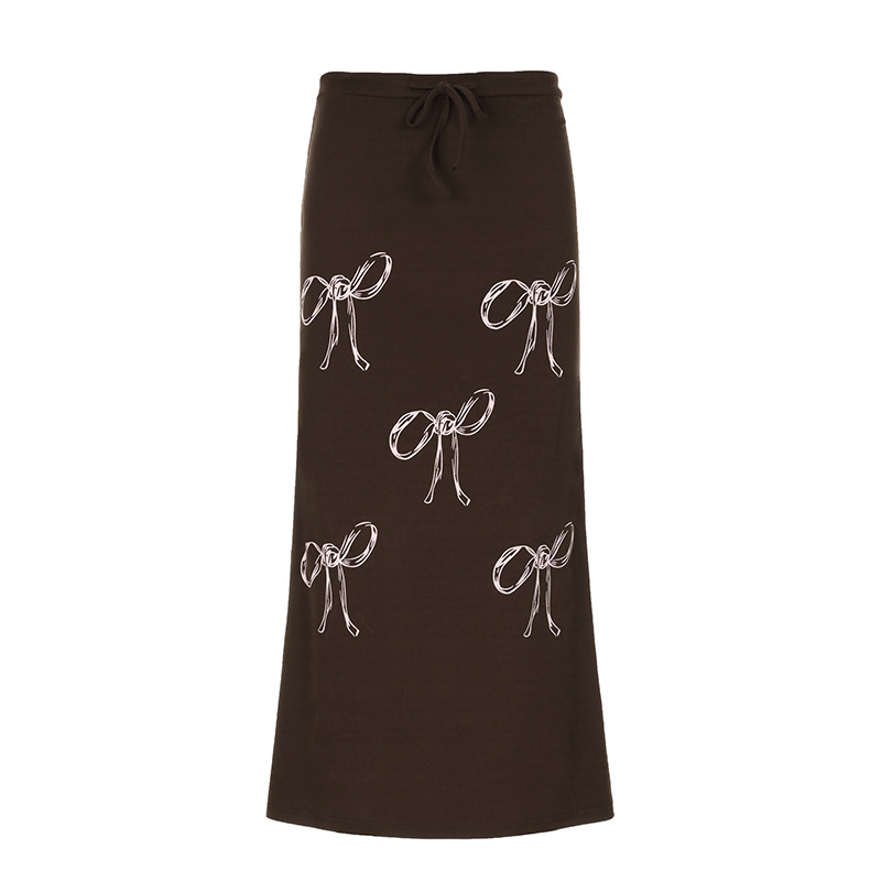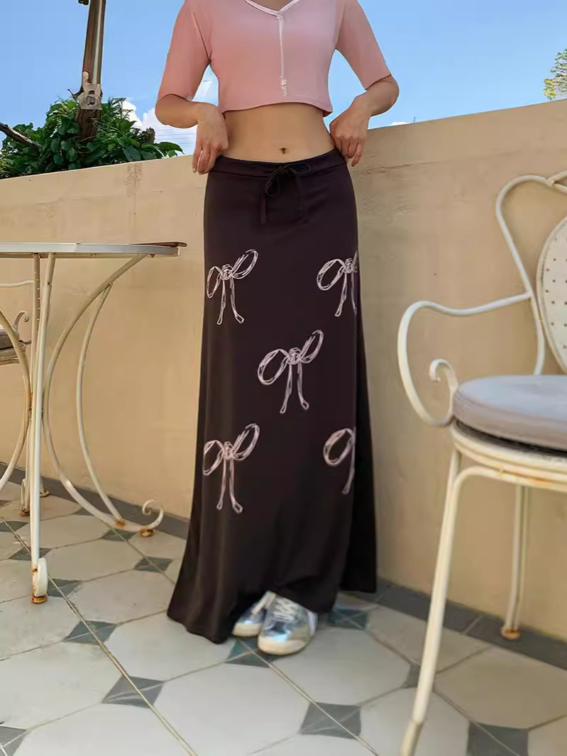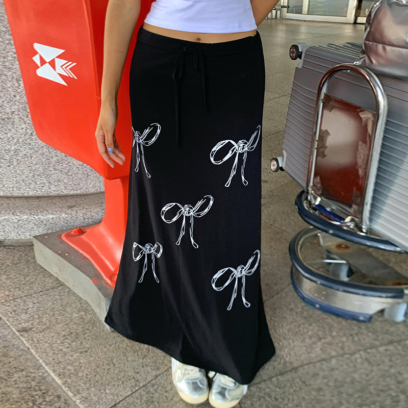 Uveng 2024 Vintage Blinding Bow Print Slimy Half-Dress Woman Low-Waist Drawstring Tie With Loose Straight Dress