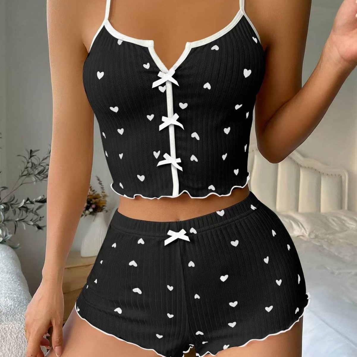 Uveng 2025 New Heart-Shaped Print Bump Color Home Clothes Front Laming Fork With Pajamas Set