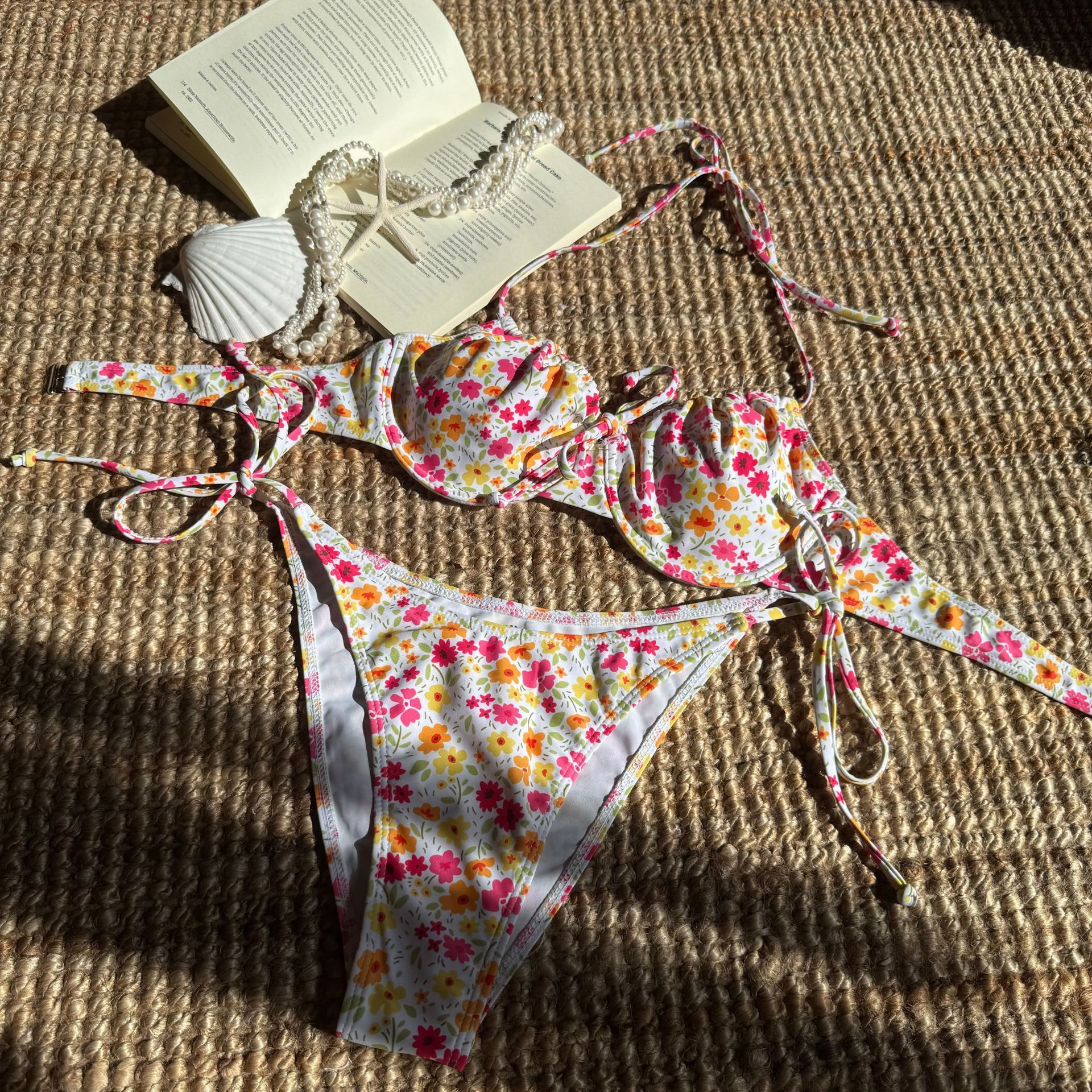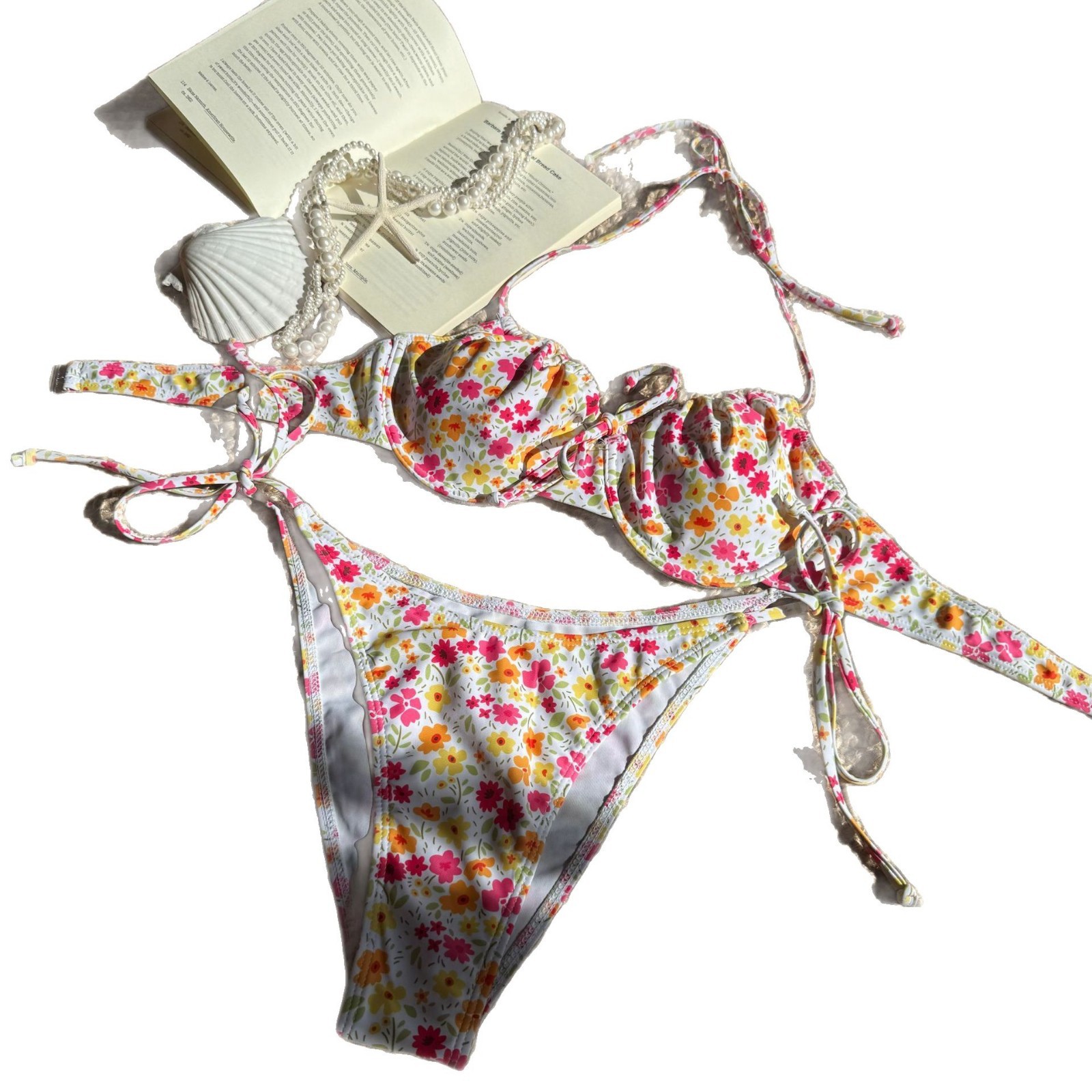 Uveng 2025 New Small Fresh Floral Print Sexy Strap Bikini Split Swimsuit Bikini