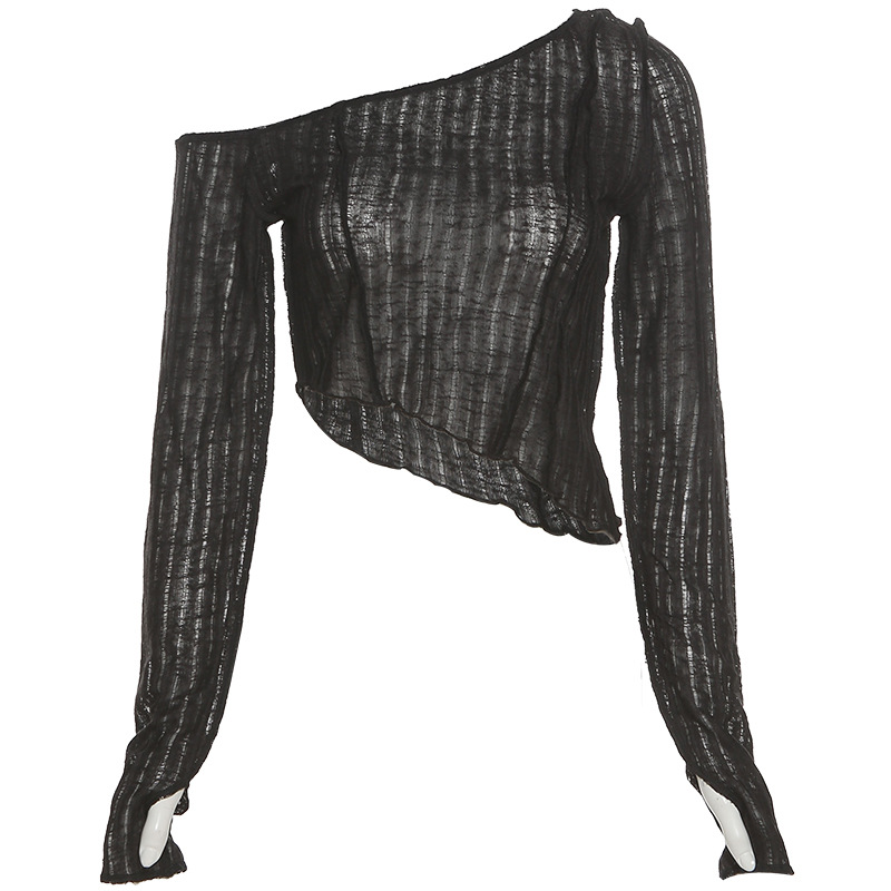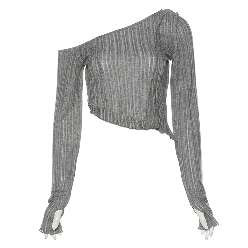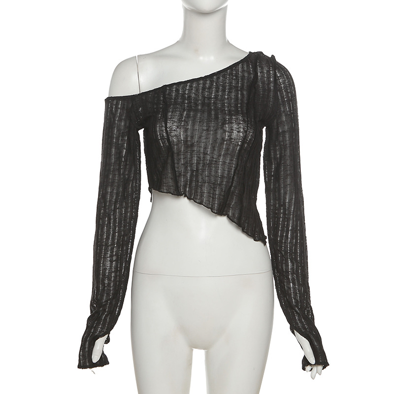 Uveng Autumn 2021 New Women's Solid-Color Fashion Slanted Shoulder Sexy Perspective Long-Sleeved T-Shirt In Wood Ear