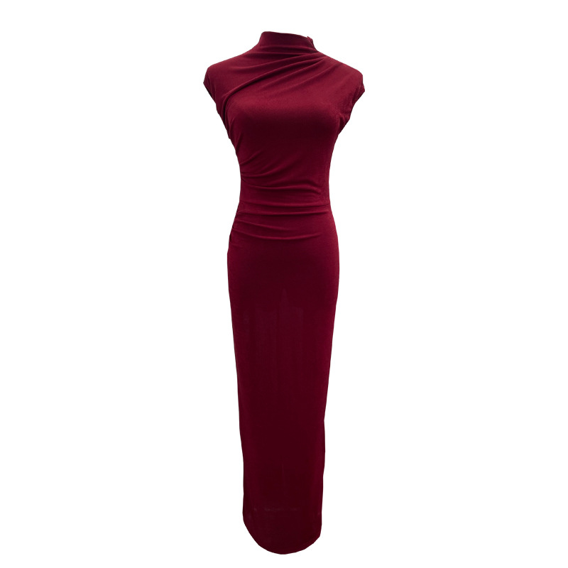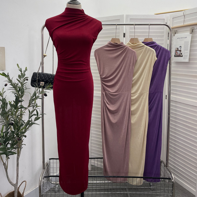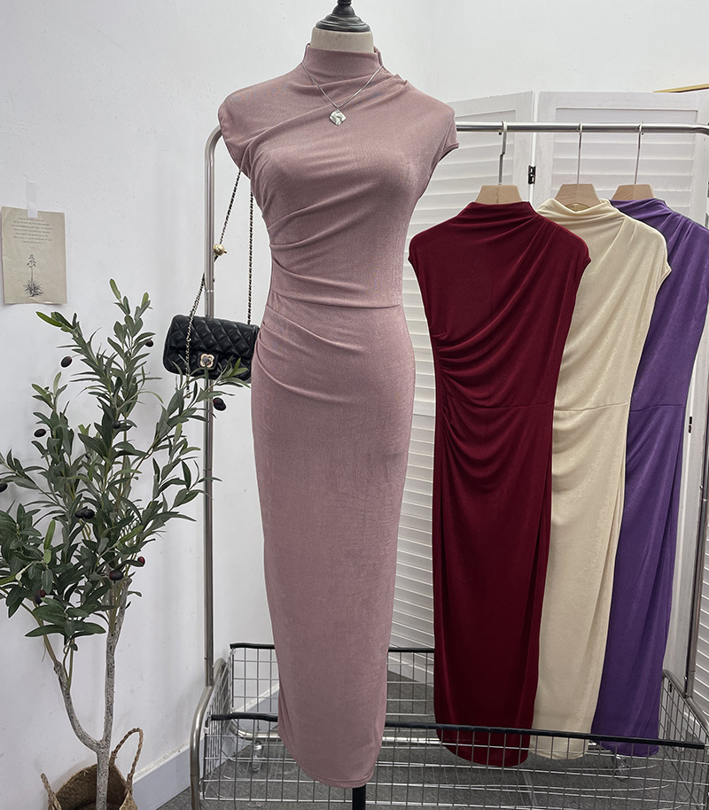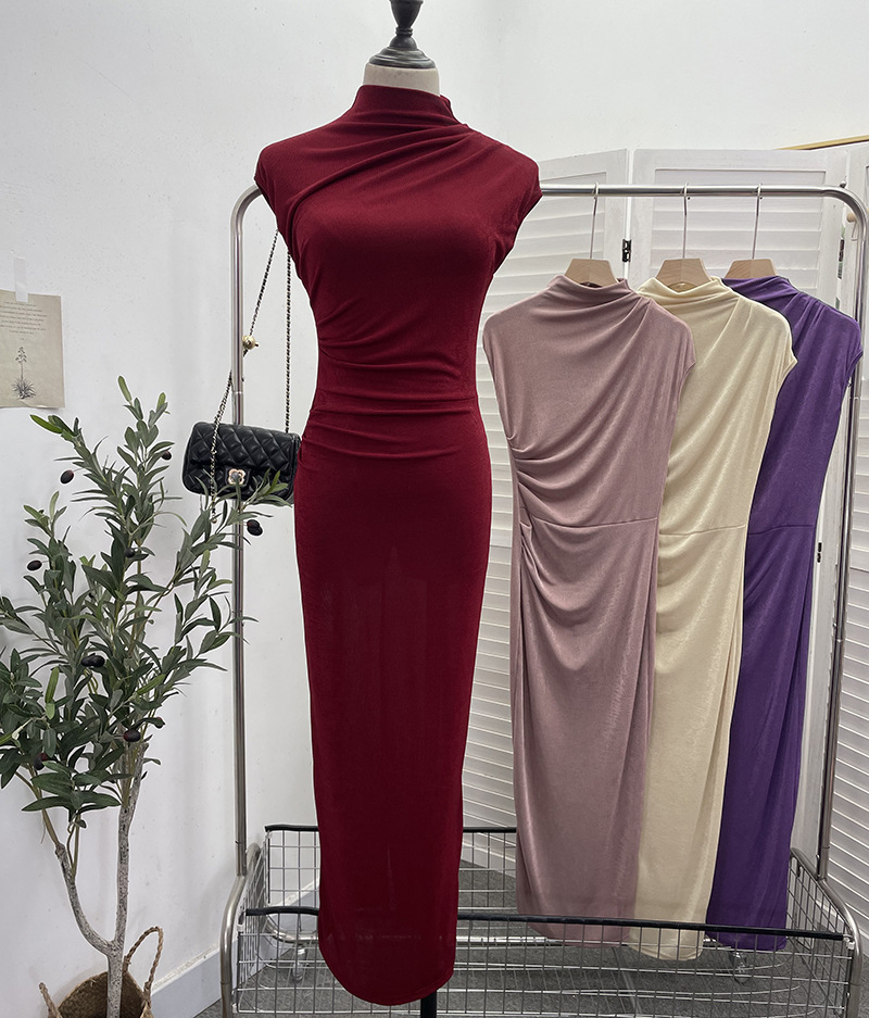Uveng Ceclent Unique Dress With Thin Folds And Hips High-Collar After The Opening Of The Fork Dress 8858