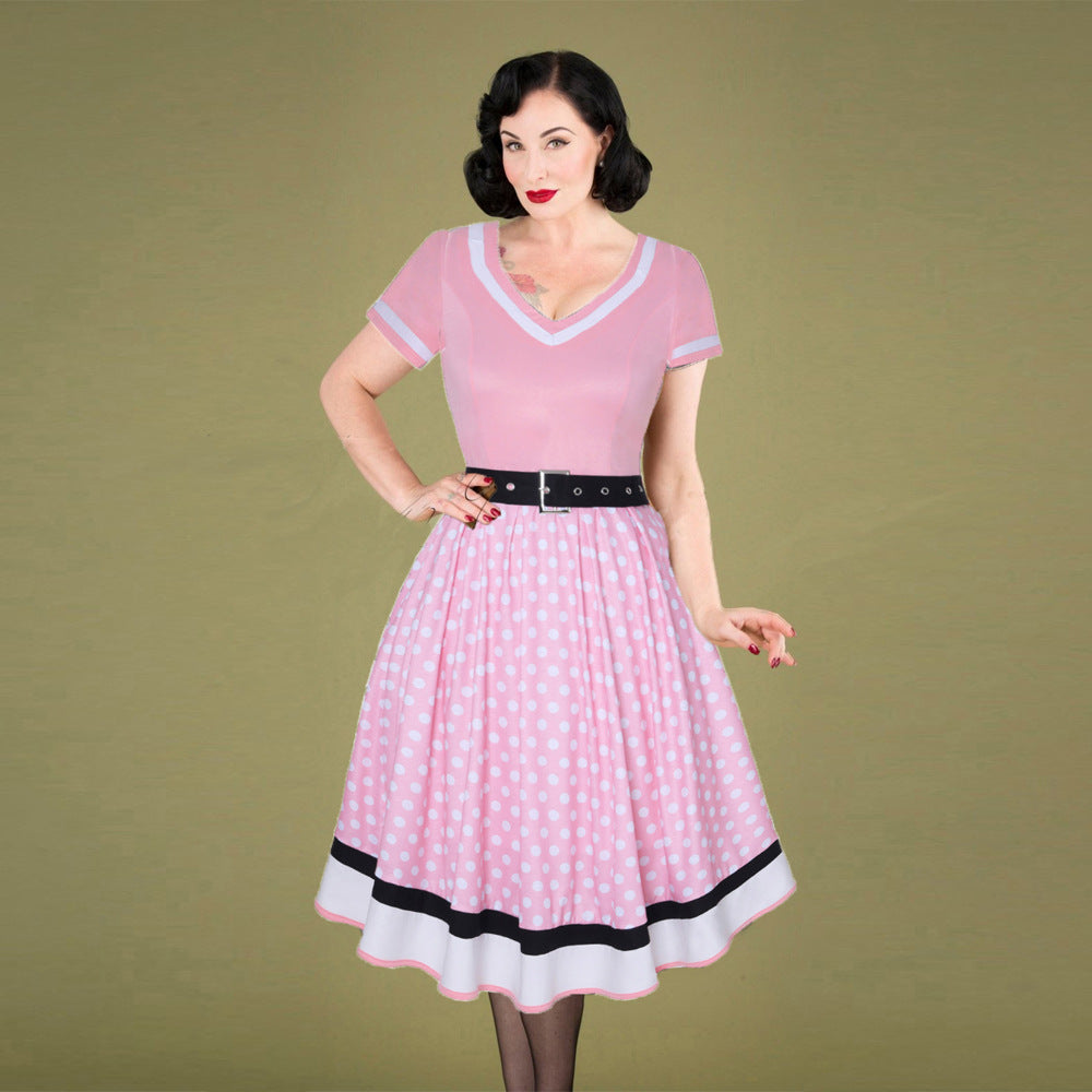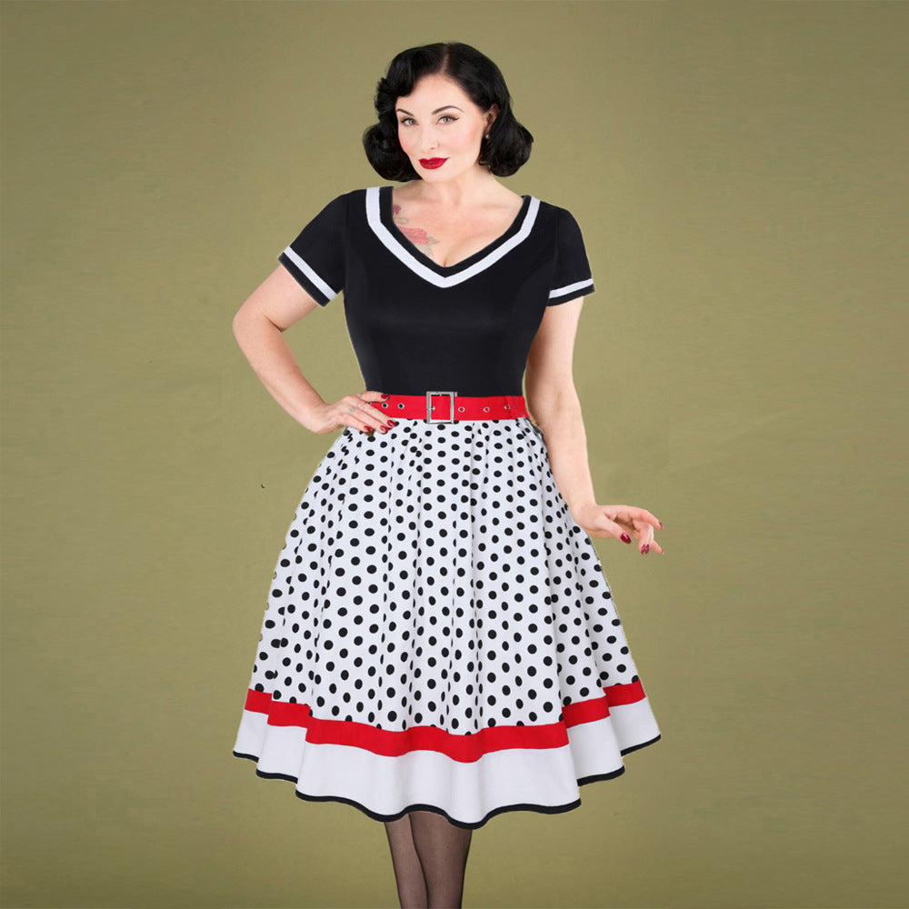 Retro Cotton Pleated Skirt V-neck Dot Swing Dress