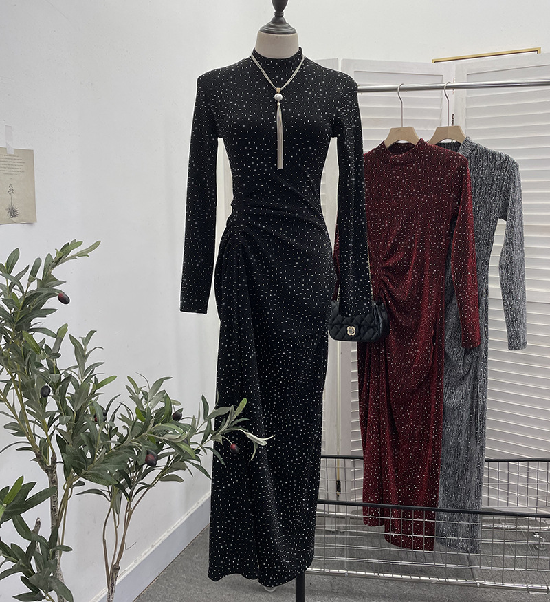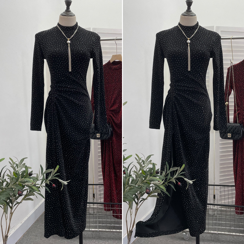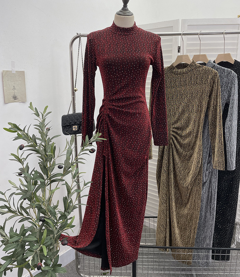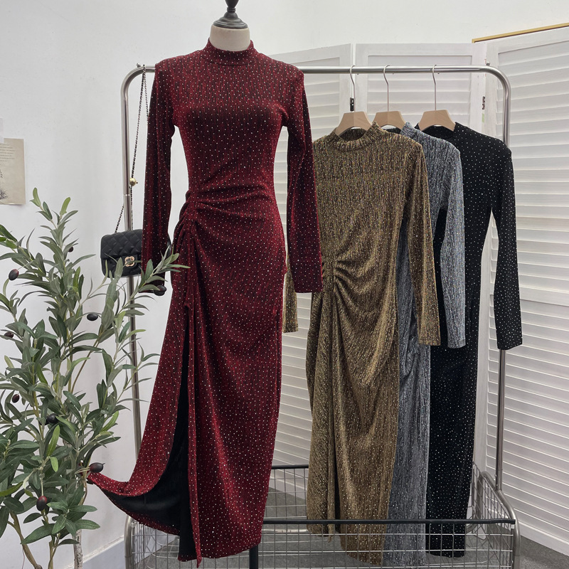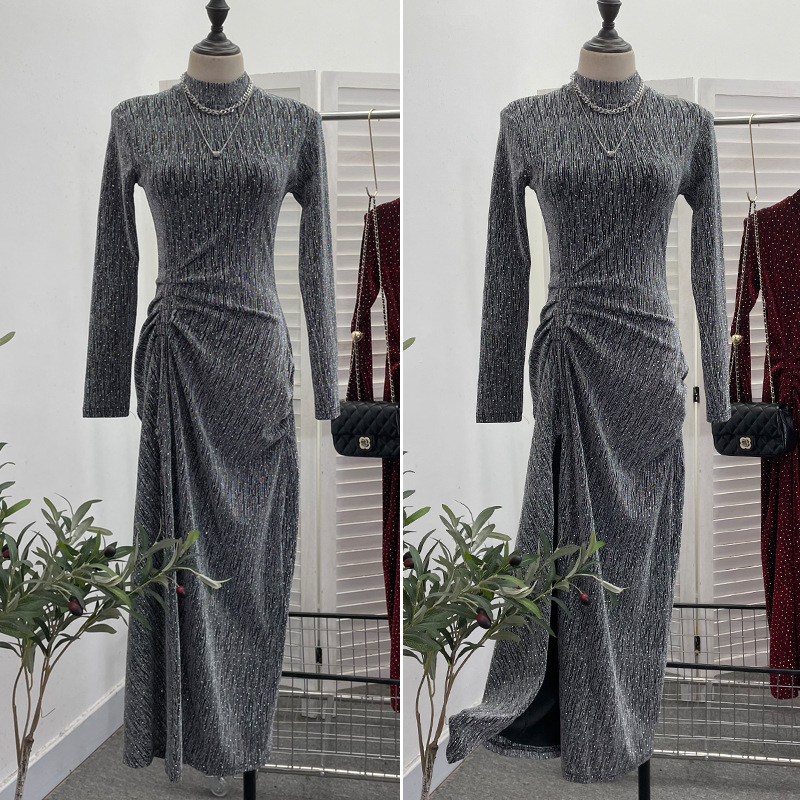 Uveng Design Sexy High Open Fork Folded Small Squint Dress Half-High Collared Shoulder Dress 8872