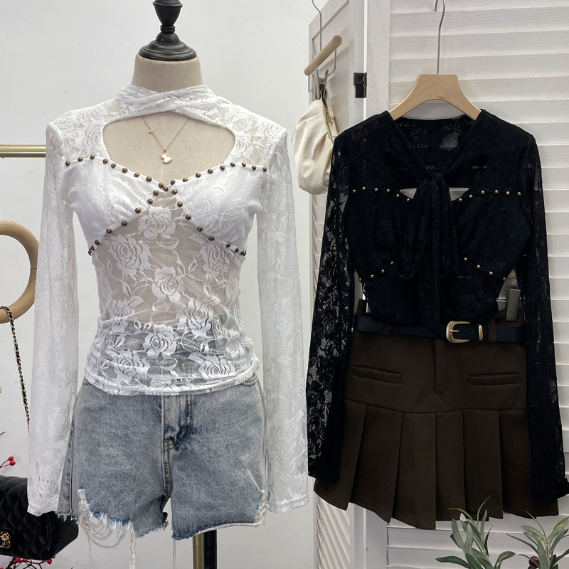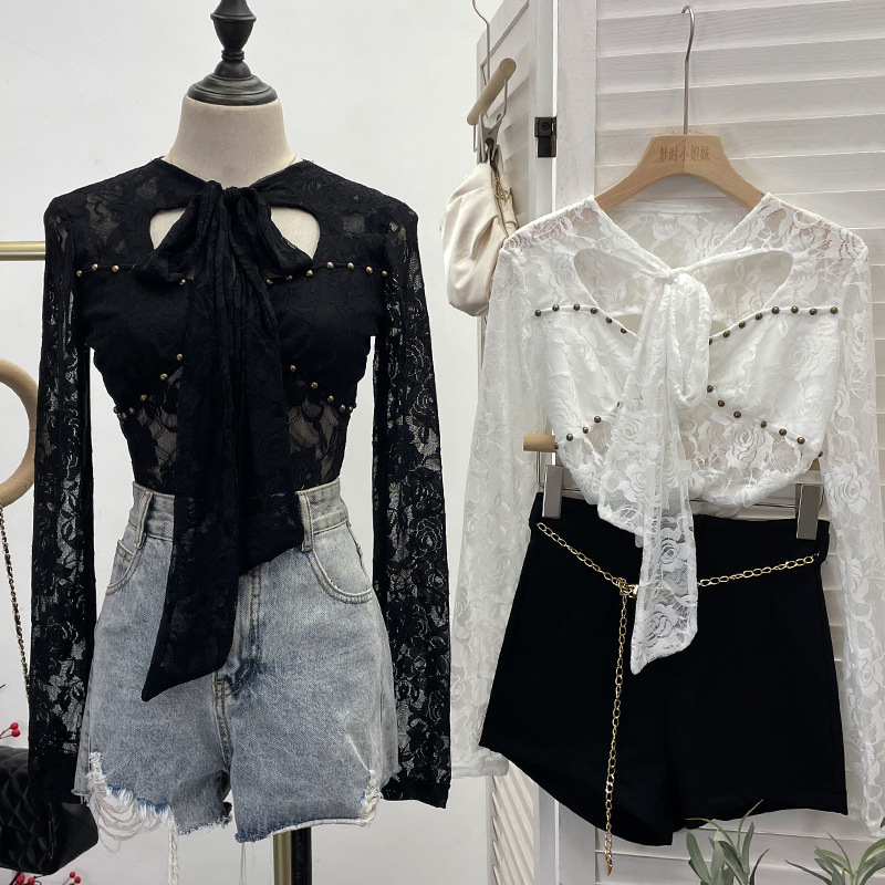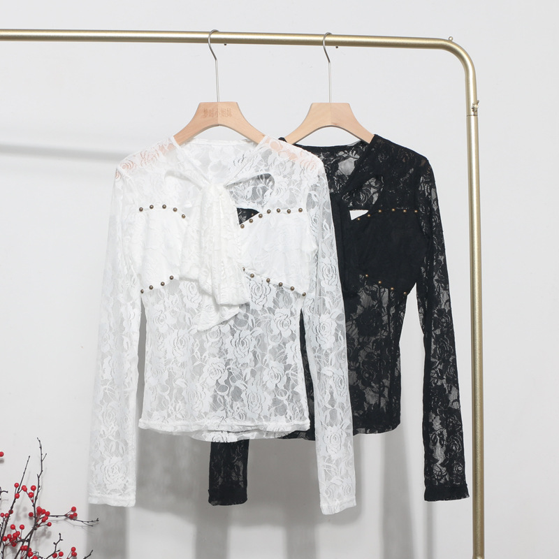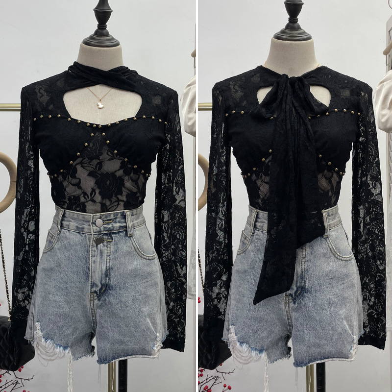 Uveng Explosion Real Shot Design Lace Ribbon Hollow Long Sleeve Top Sexy Slimming Bottom T-Shirt 8979