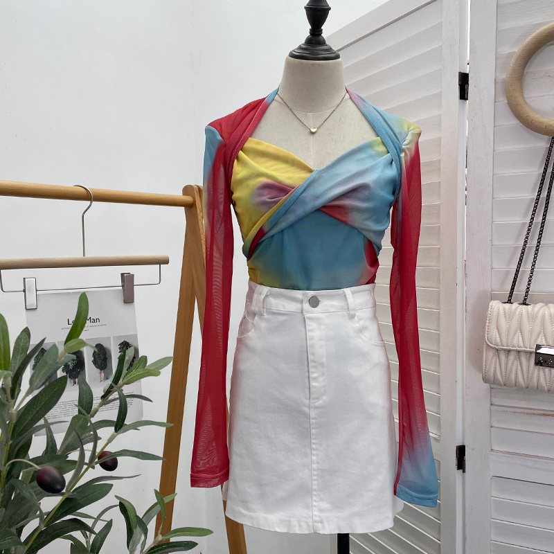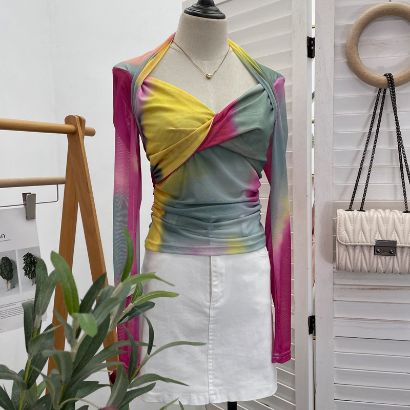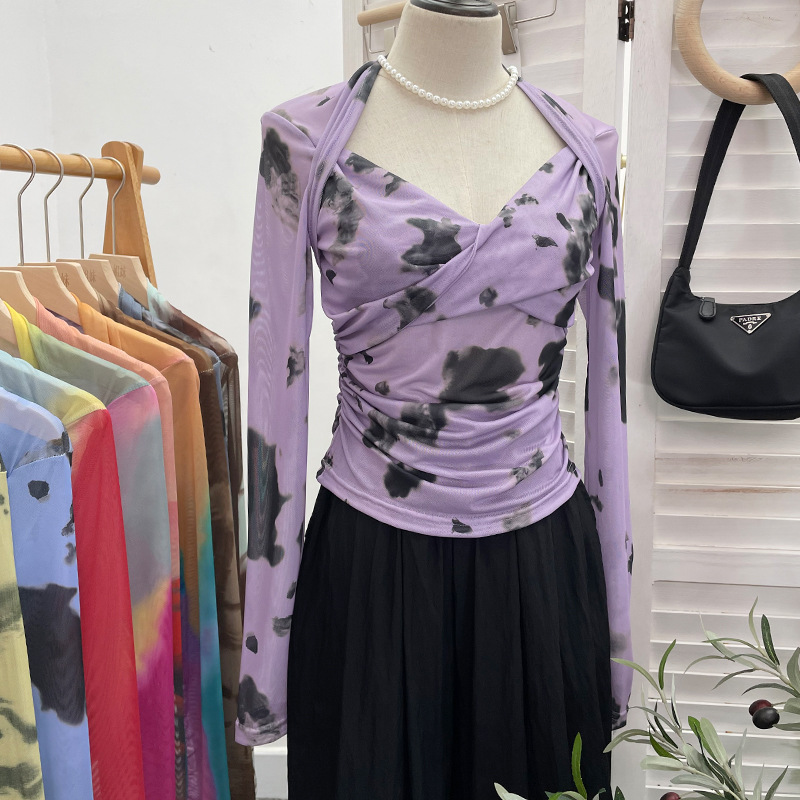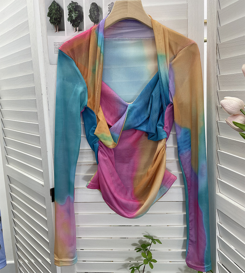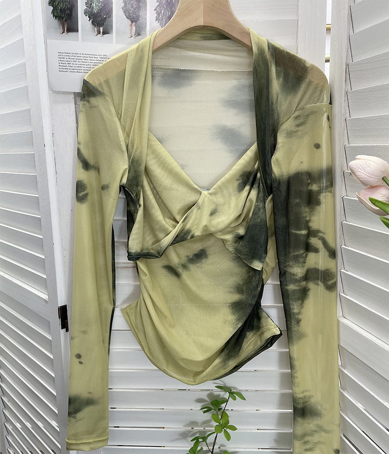 Uveng Explosion Tie-Dye-Print Long Sleeve Bottom Sexy Hottie V-Neck T-Shirt Folded Slimming Mesh Yarn Top 8929