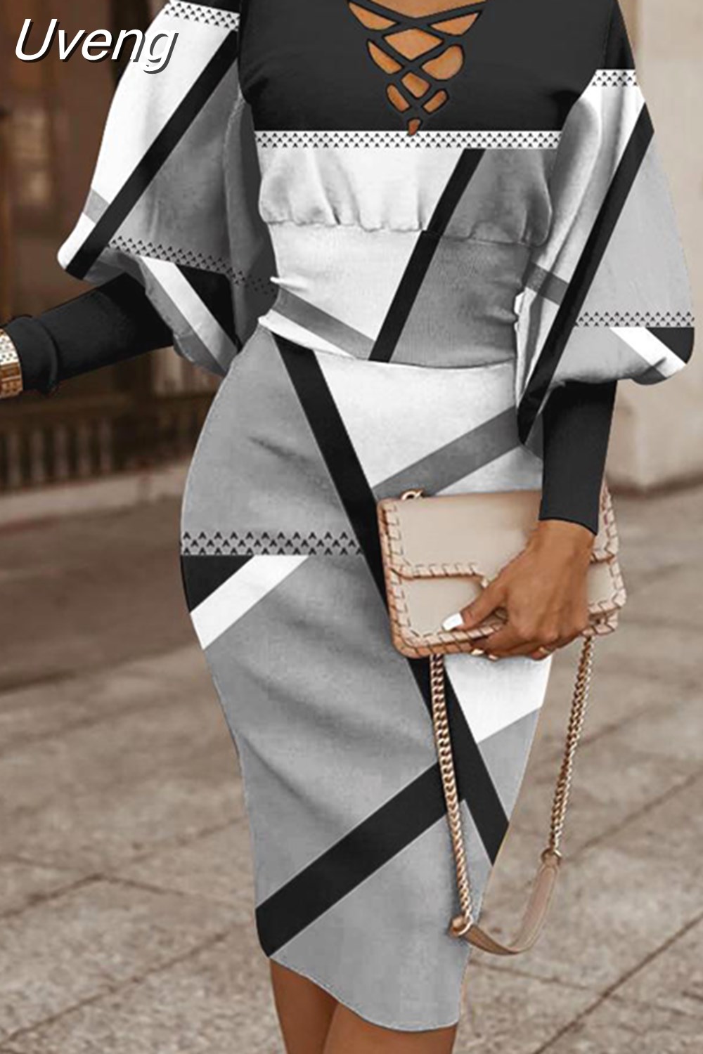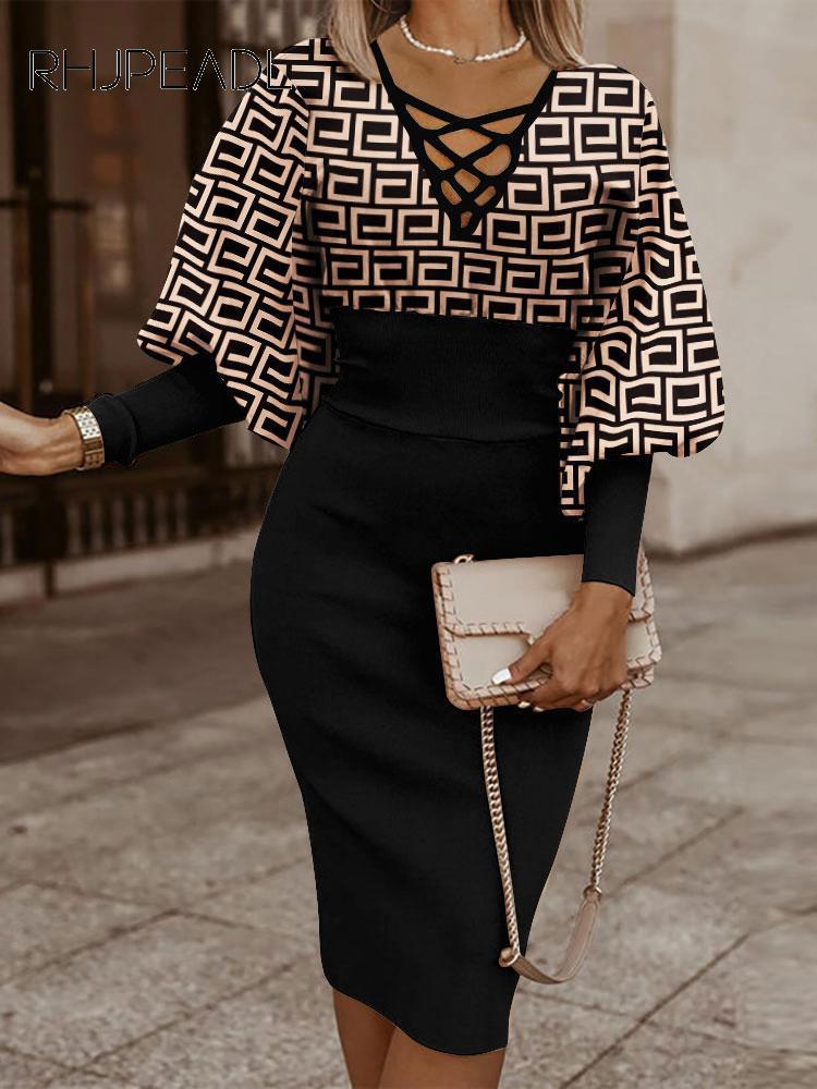Uveng Fashion Printed Lantern Sleeve Dress Women Office Ladies Elegant V-Neck Long Sleeve Slim Dress Women