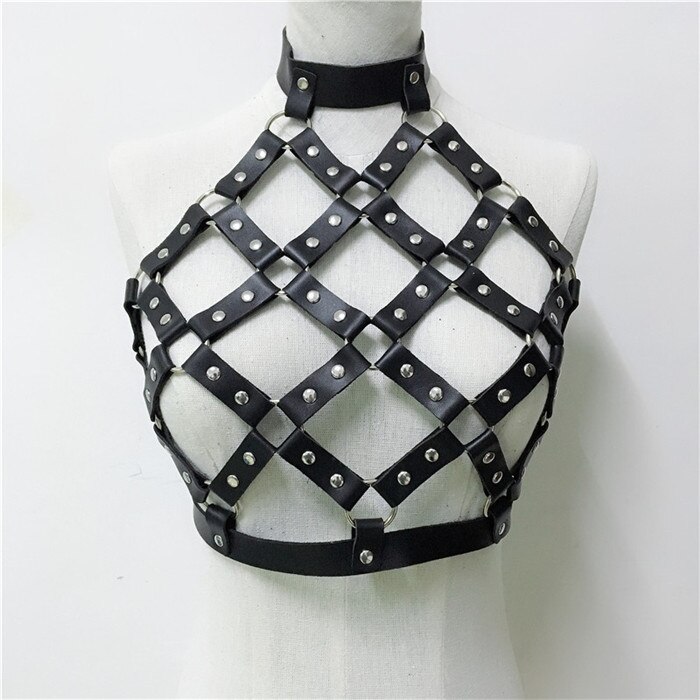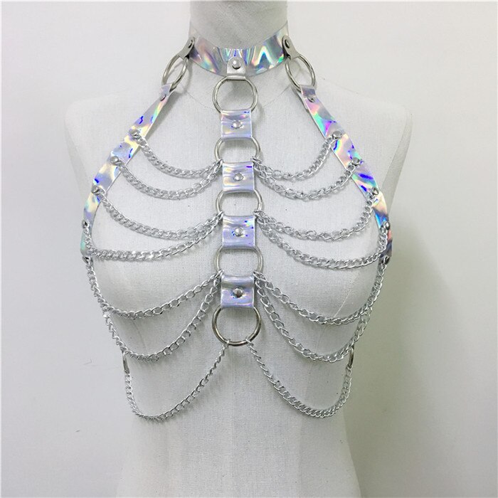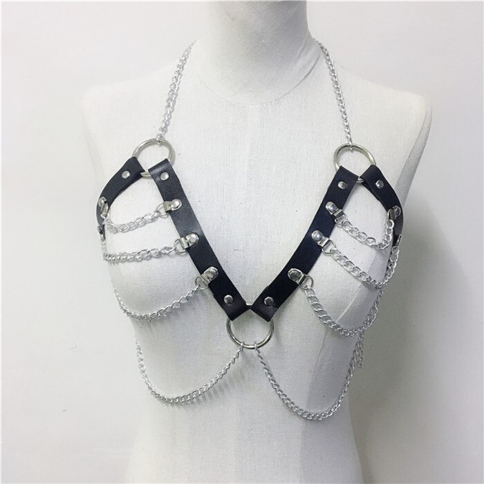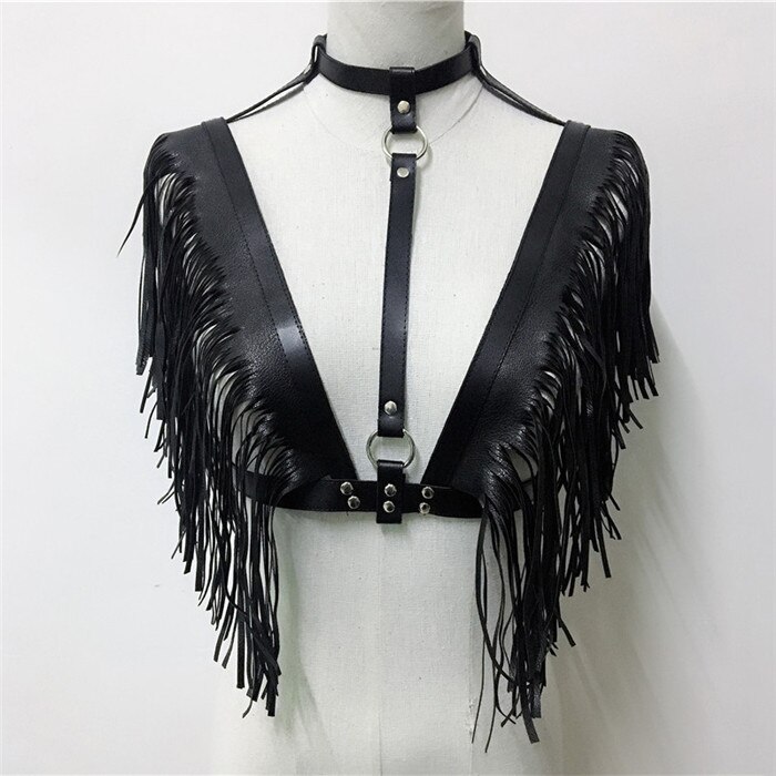 Uveng Faux Leather Hollow Out Crop Top Women Link Chain Long Tassel Tank Tops Stage Performance Costume Party Rave Festival Tops