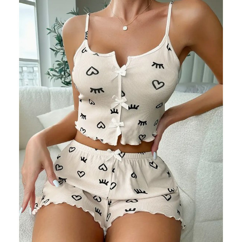 Uveng Heart-Shaped Eyelash Print Pajamas Set V-Neck Slings Shorts Ladies Homewear