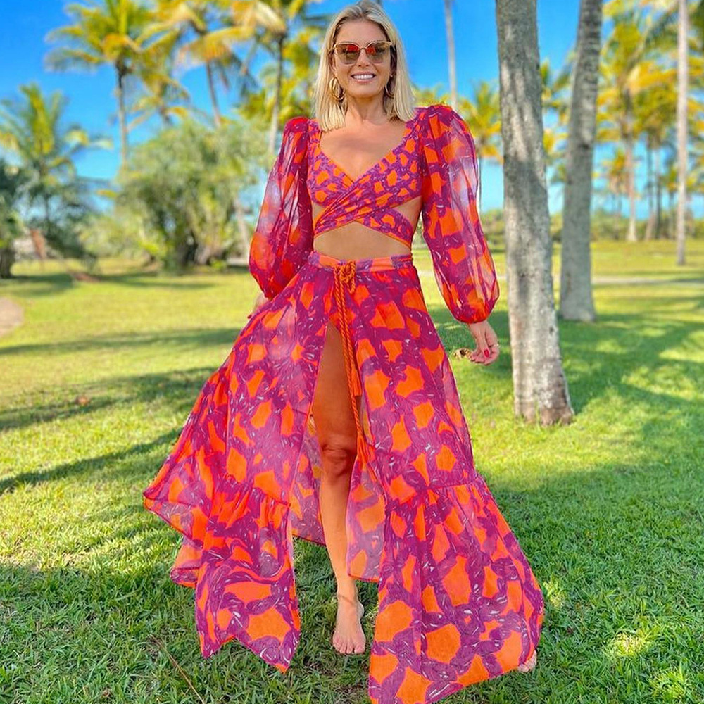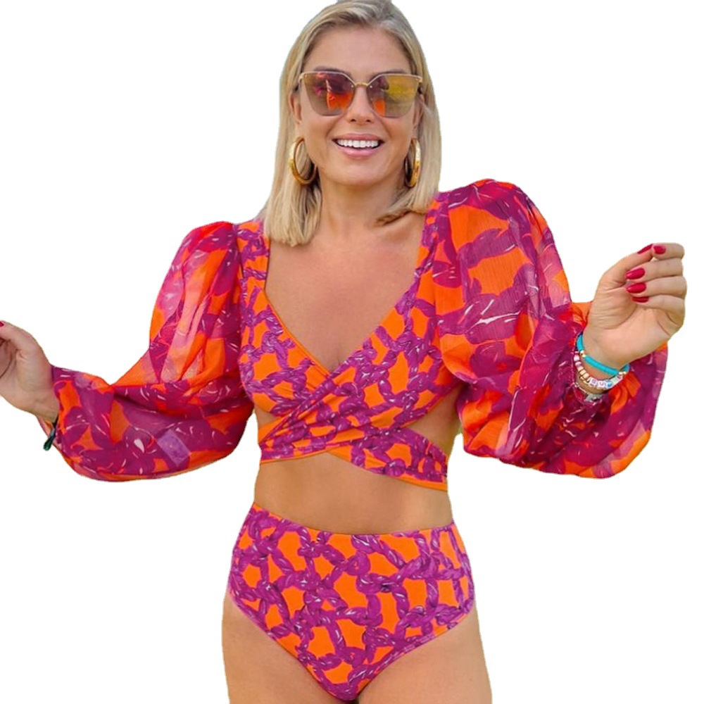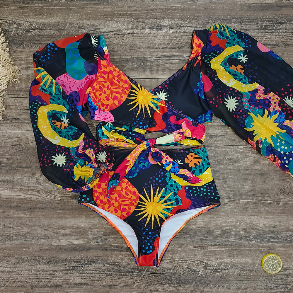 Uveng High-Waisted Split Long-Sleeved Swimsuit Women 2025 New Sexy Dew Back Cross-Tie With Deep V Bikini