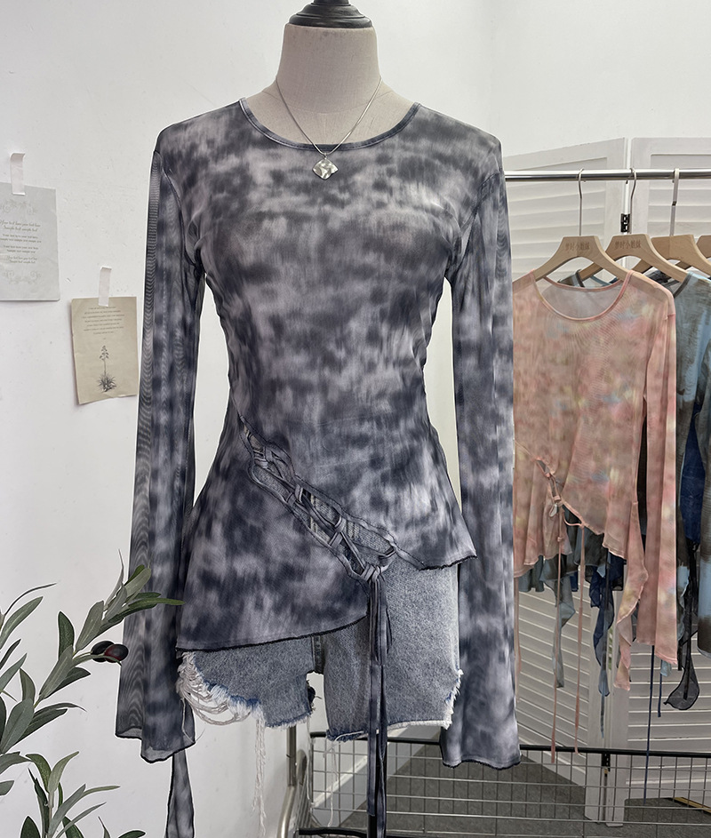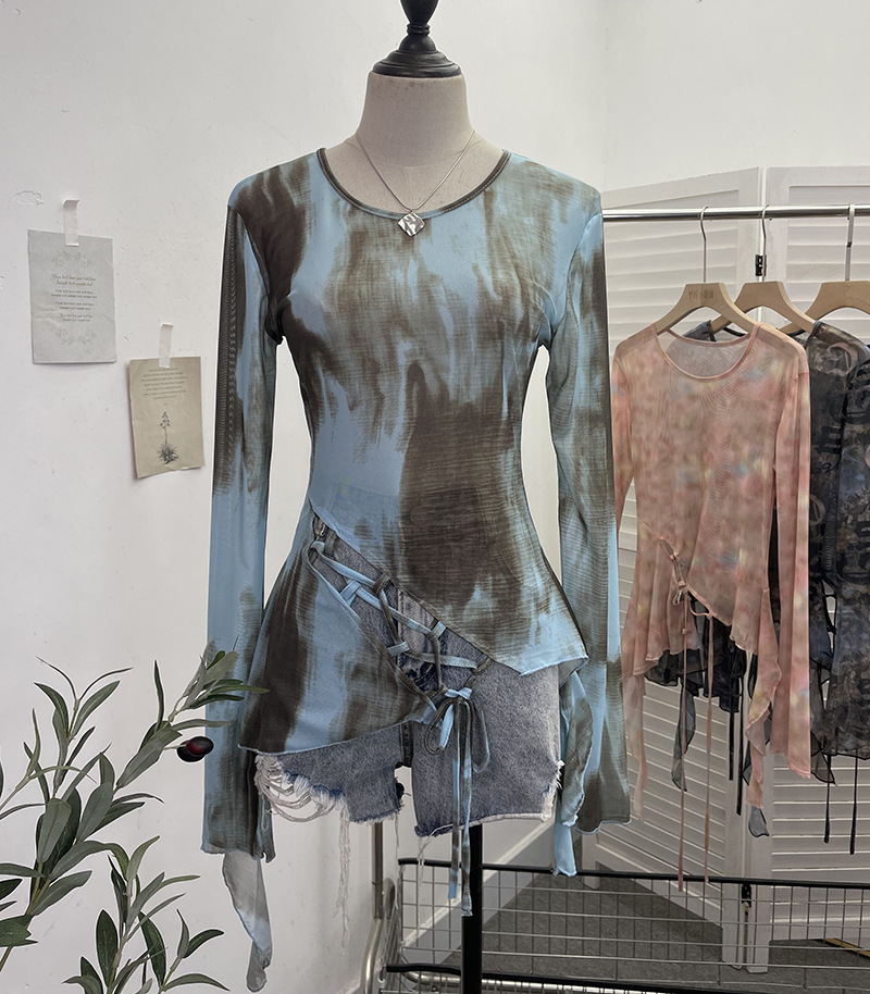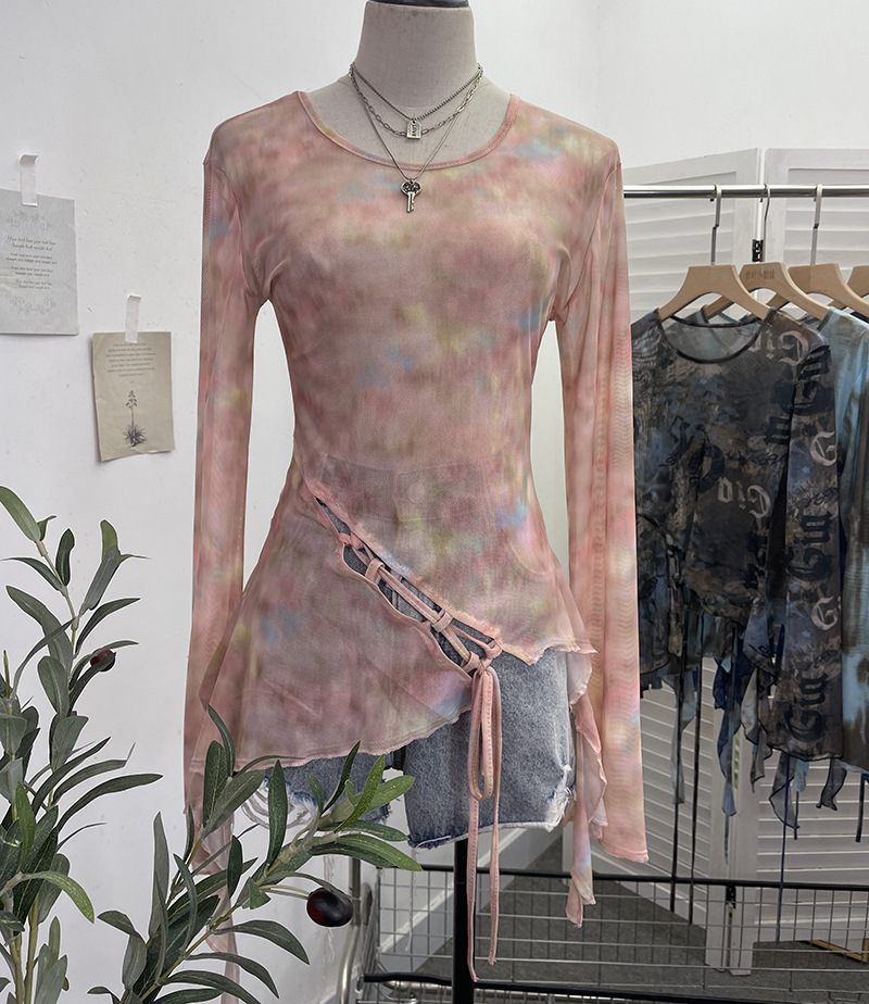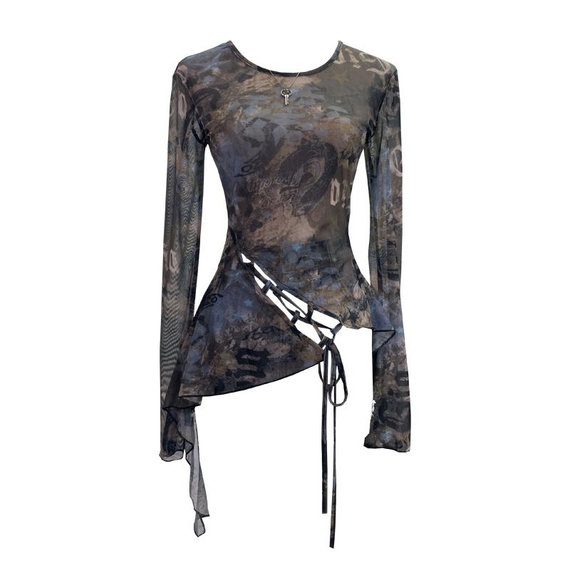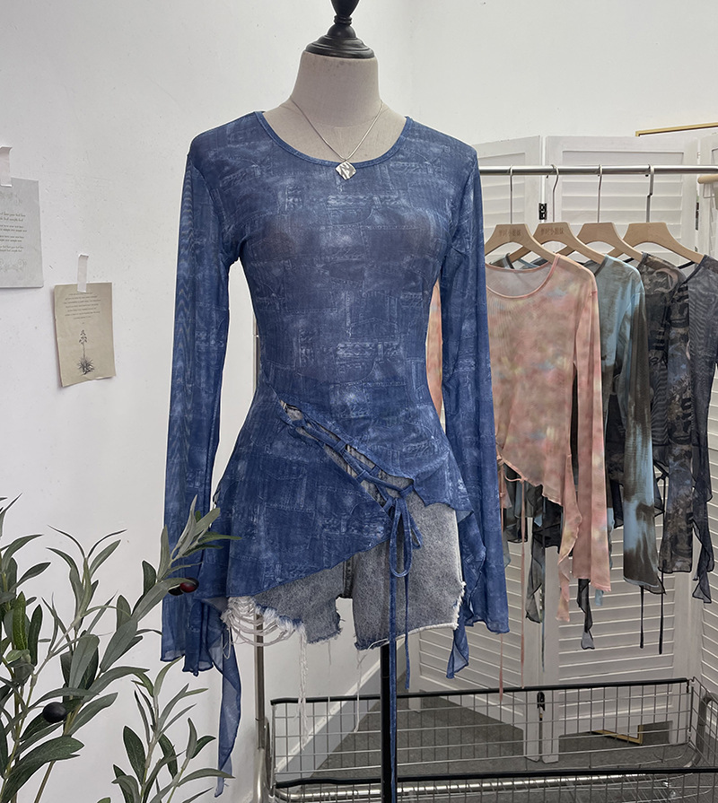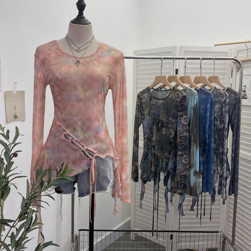 Uveng Irregular Tie With Lotus Leaf Side Tie Print Mesh Yarn Perspective Sunscreen Shirt T-Shirt T-Shirt Short T-Shirt 9928