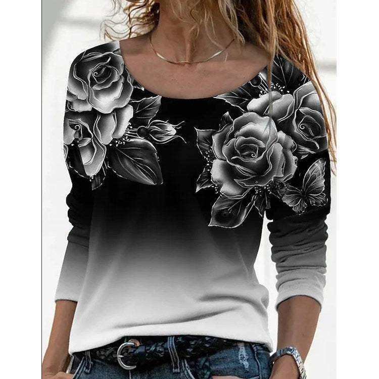 Women's Long Digital Printing Sleeve Loose Neck Casual Pullover Print T-shirt