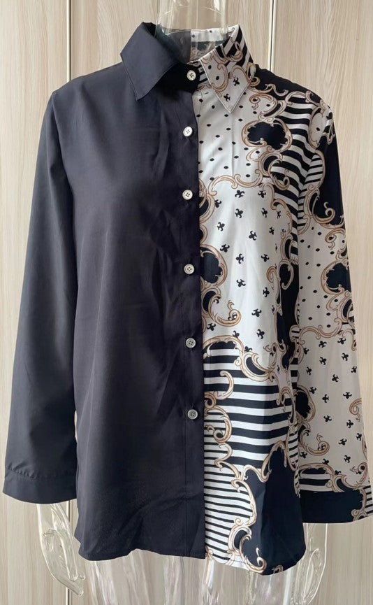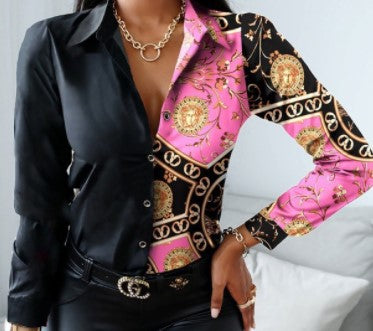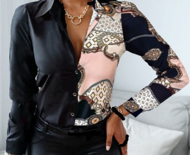 Cardigan Long Sleeve V-neck Color-block Retro Shirt Top