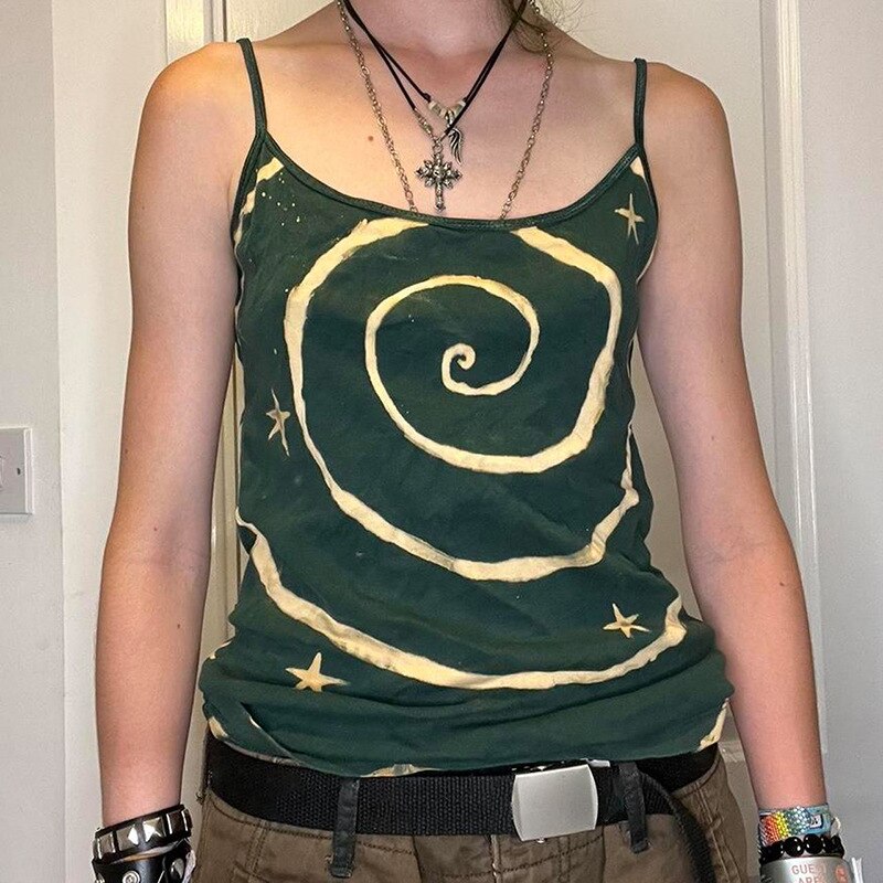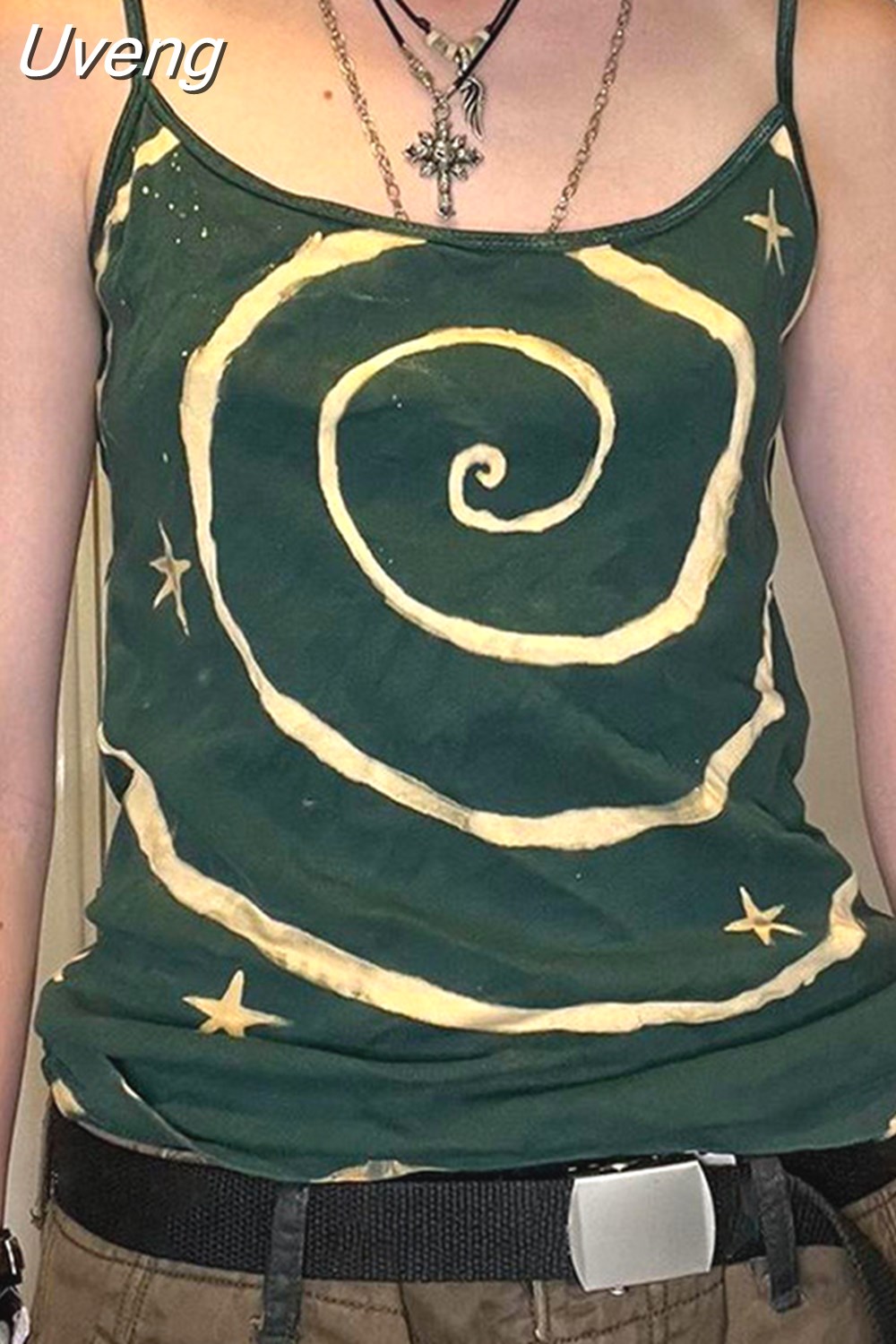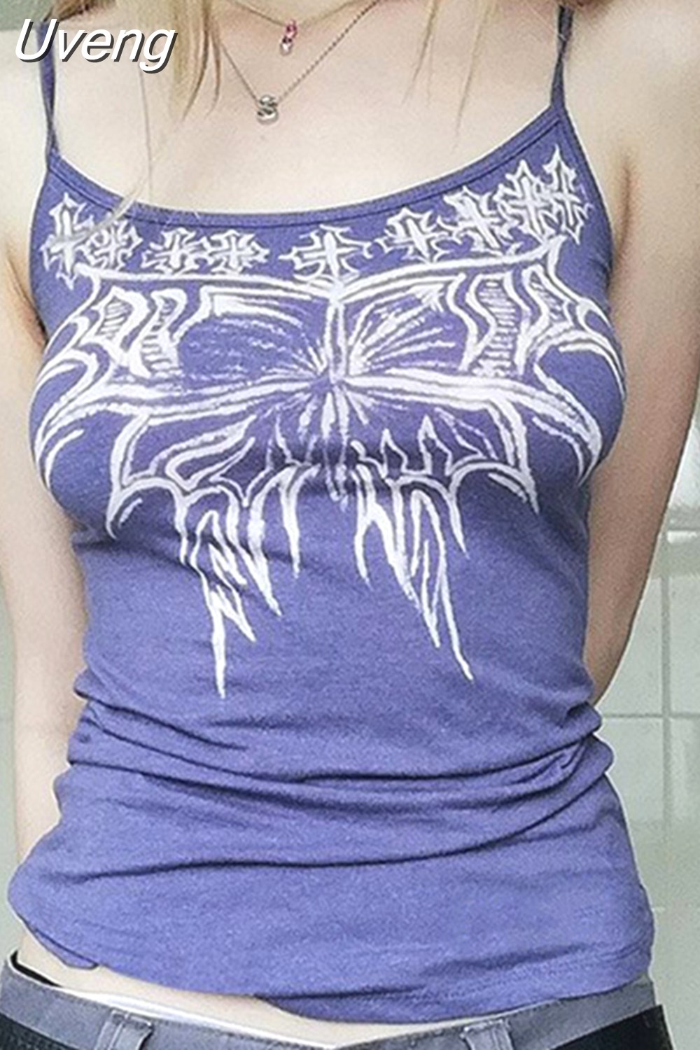 Uveng Mall Goth Retro Print Crop Top 00s Vintage Grunge Slim Fit Mini Vest Sexy Backless Spaghetti Strap Camisole Y2K Clothes 413-1