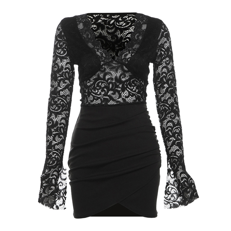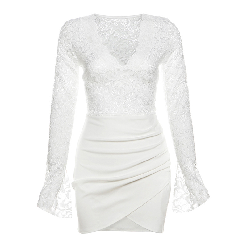 Uveng New Women's Clothing Simple Solid Color Lace Decoration V Collar Long Sleeve High Waist Tight Skirt