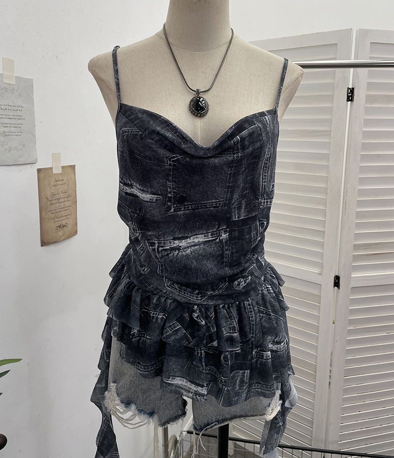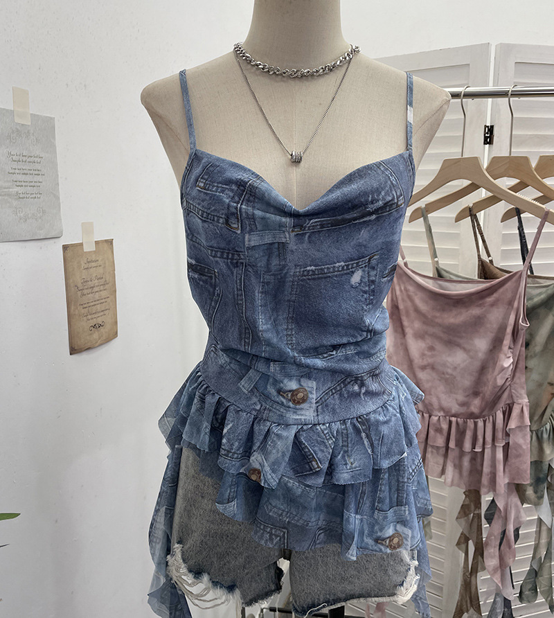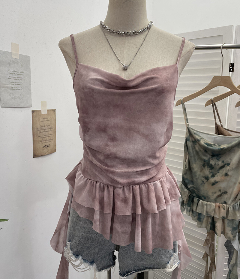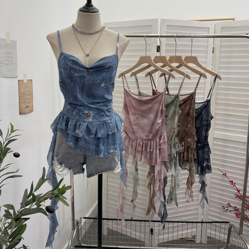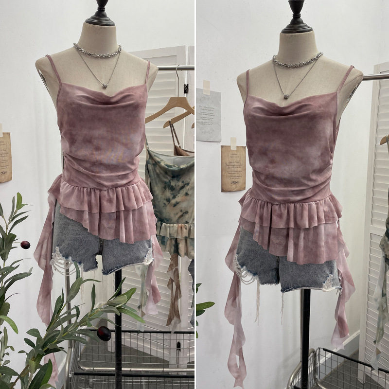 Uveng Real Shoot Spice Girl Swing Network Yarn Print Sling Vest Retivating Lotus Leaf Side Ribbon Short Top 1210