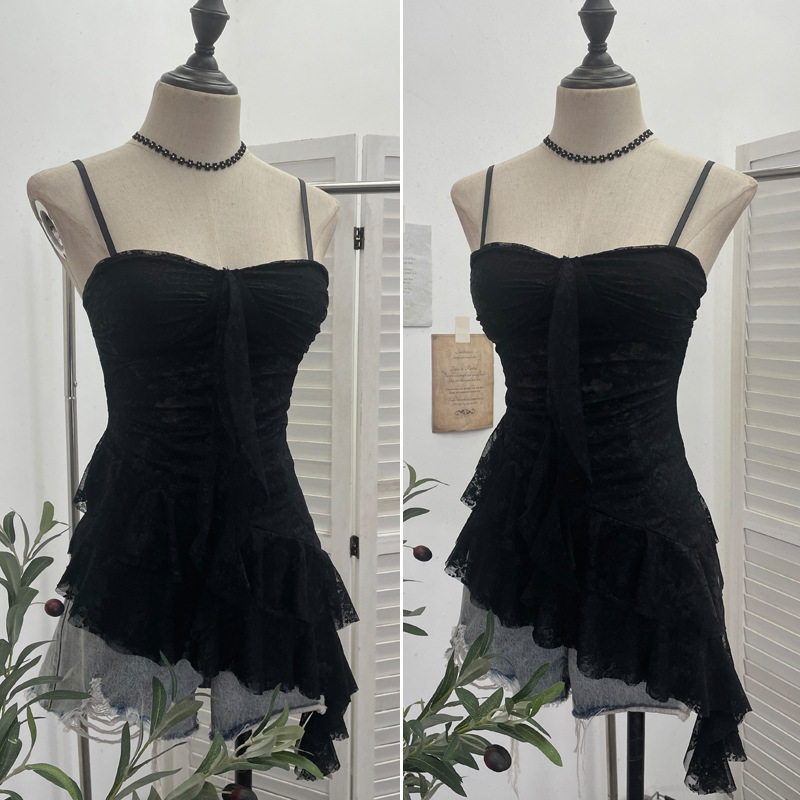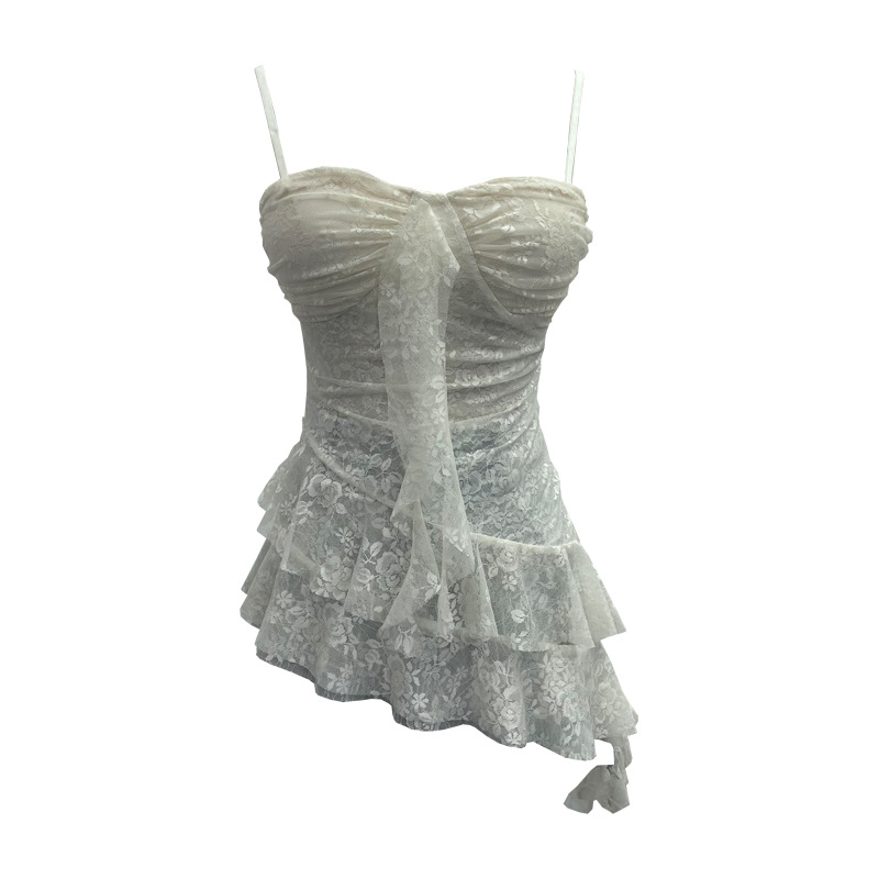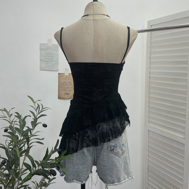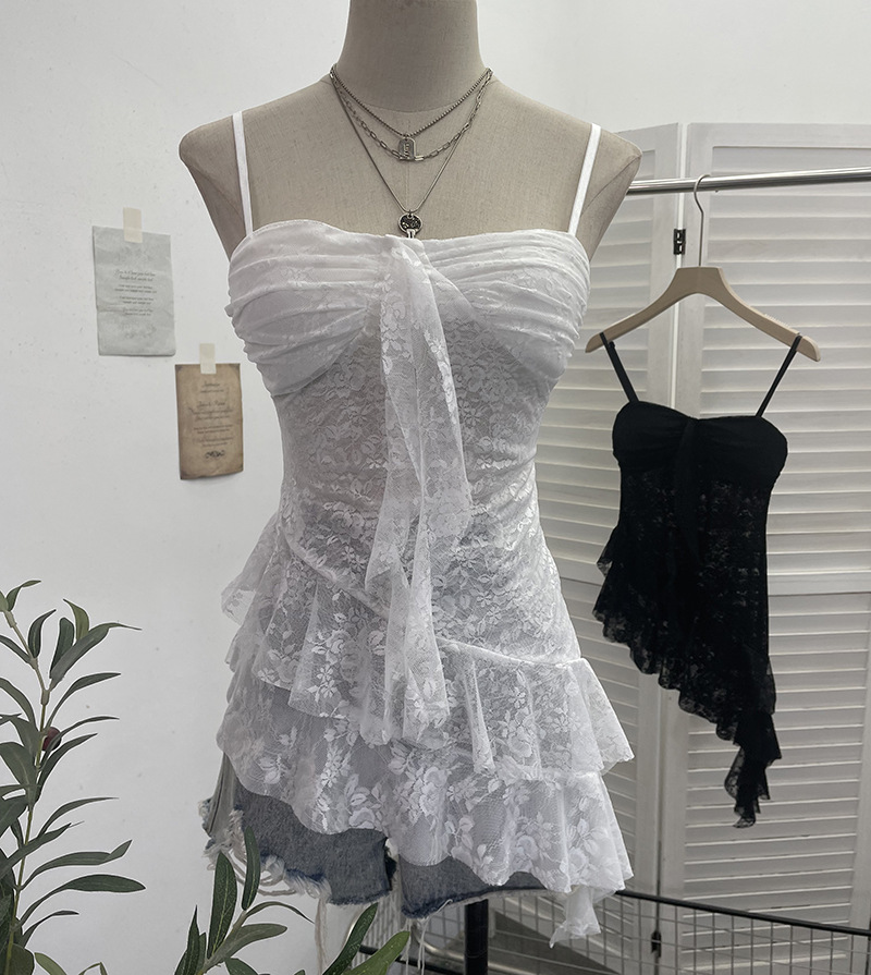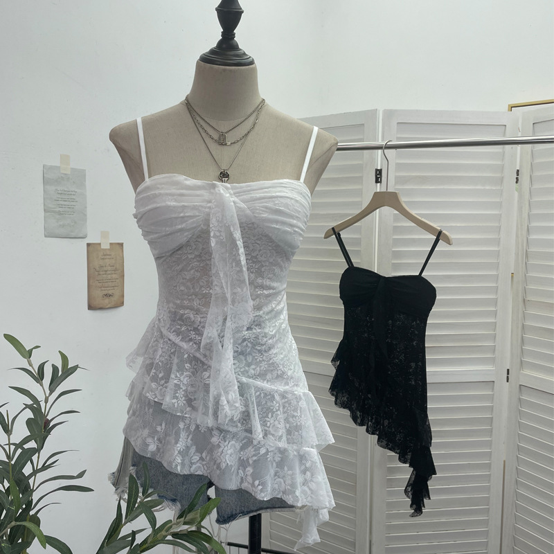 Uveng Real Shoot Sweet Spice Girls Irregular Lotus Side With Chest Pad Sling Vest Sexy Lace Sleeveless Top 1139