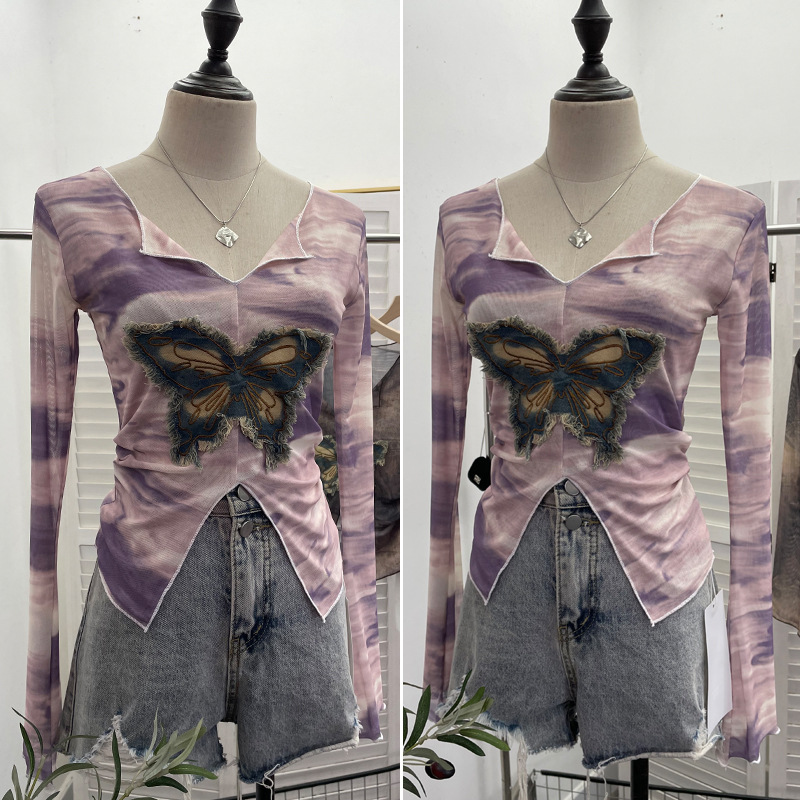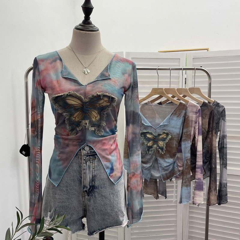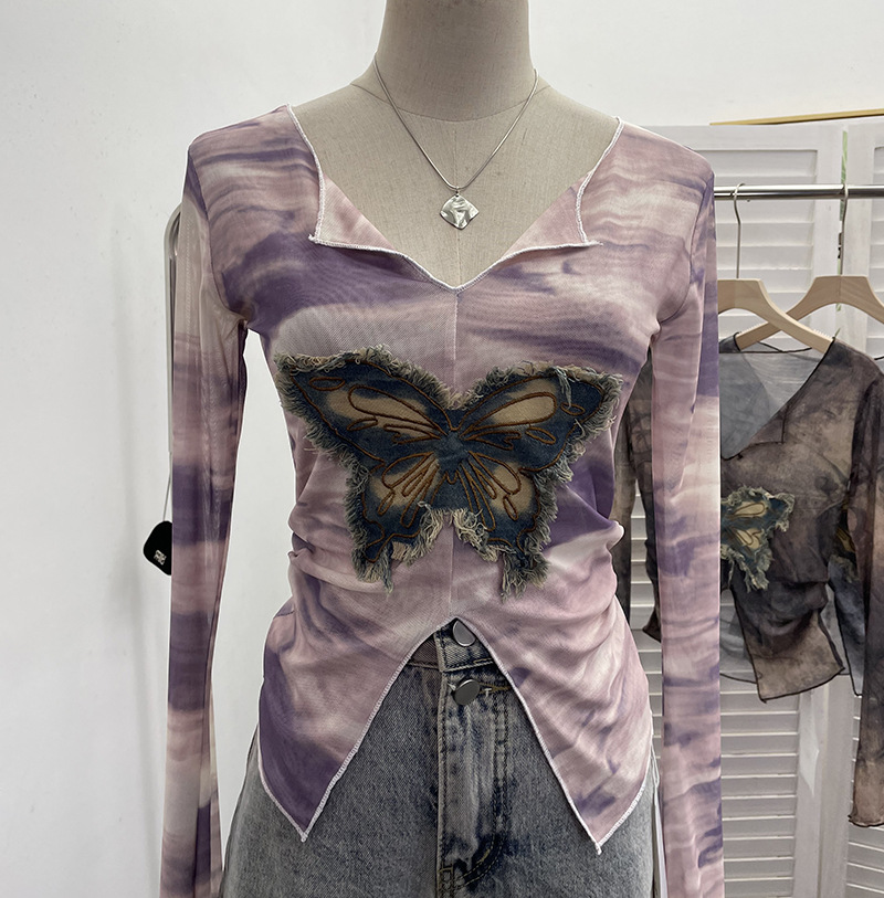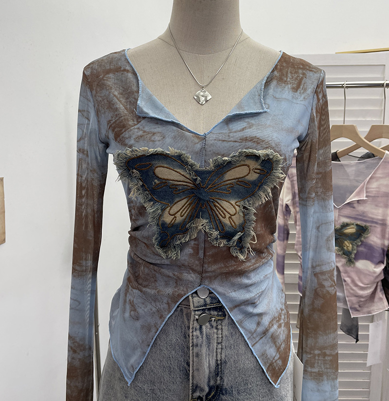 Uveng Real Shooting Amount Of Bumpy Tulle Spliced Denim Butterfly Design Sunscreen Coat V Collar Short T-Shirt 1965