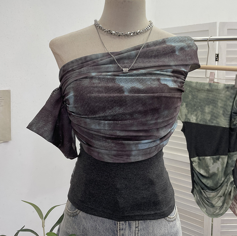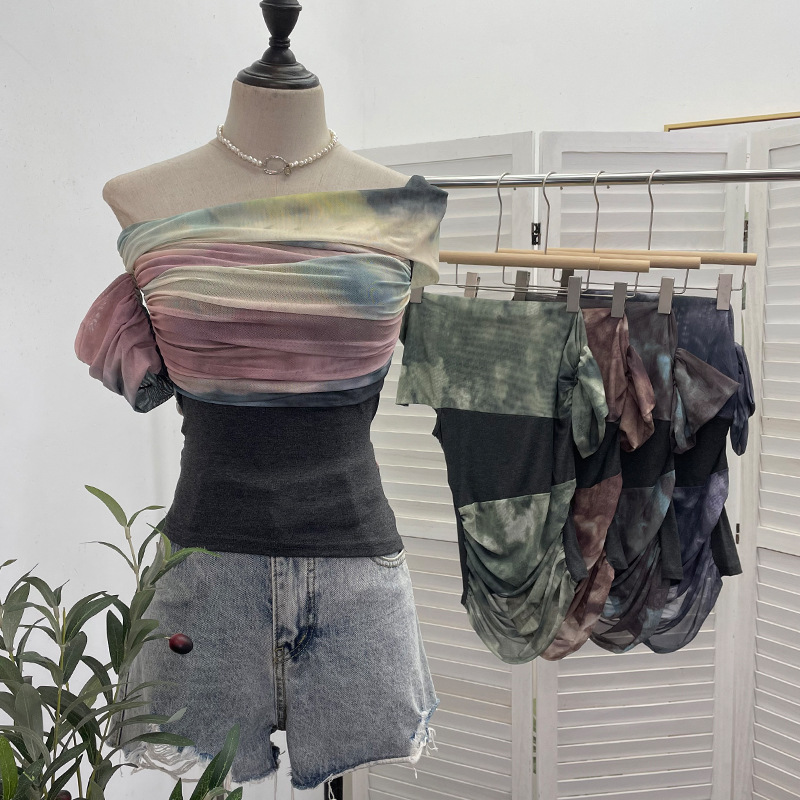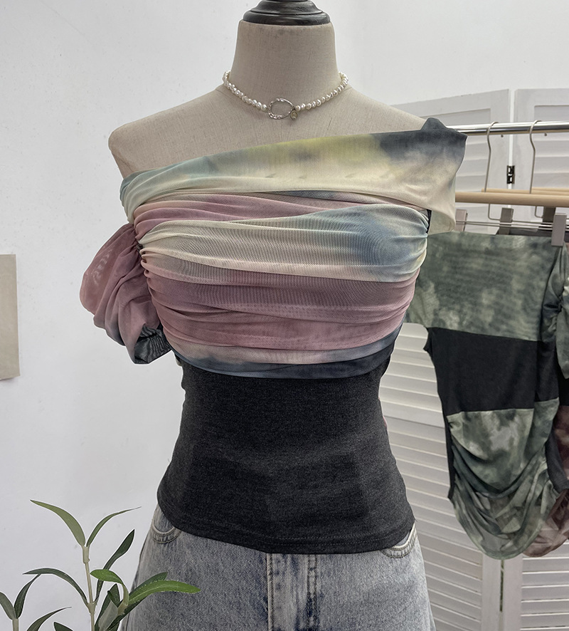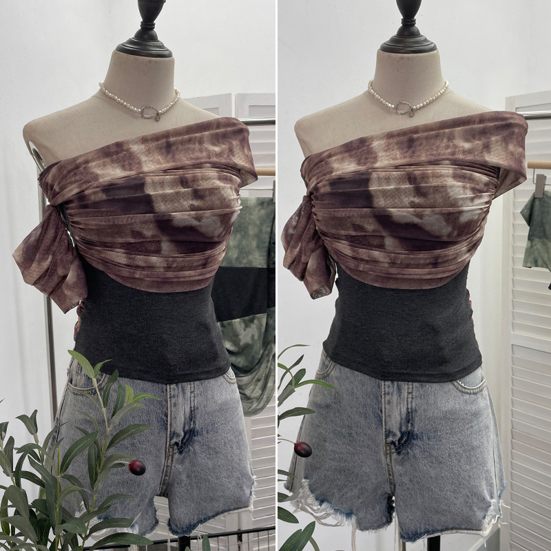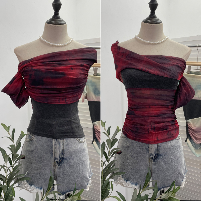 Uveng Real Shooting Can Wear Two-Wear Art Dizzy Net Yarn Spliced A Word Shoulder T-Shirt To Repair The Chest Short Babes Top 1131