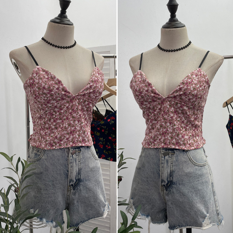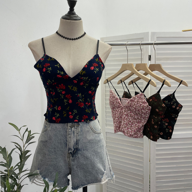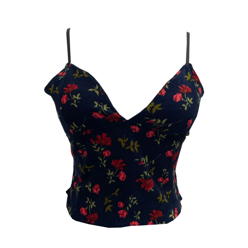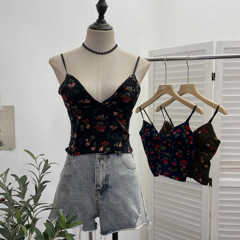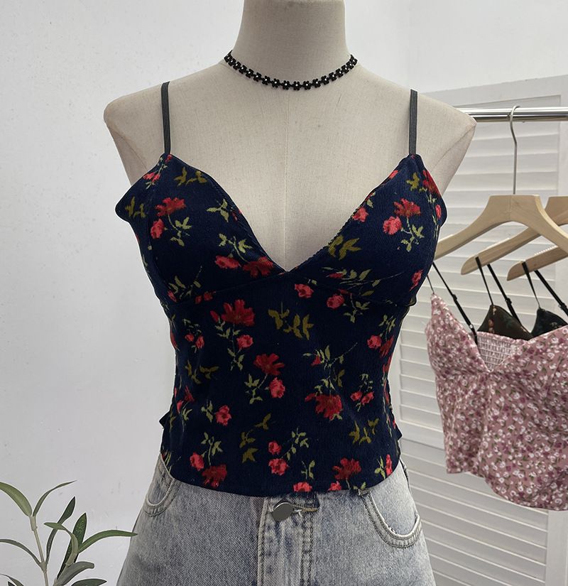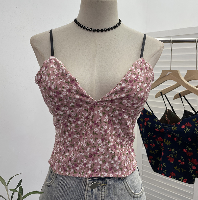 Uveng Real Shooting Hottie Deep V-Neck Broken Flower Short-Sized Hong Kong Wind Sling Female Wear With Chest Cushion Small Waistcoat Sleeveless Top 1727