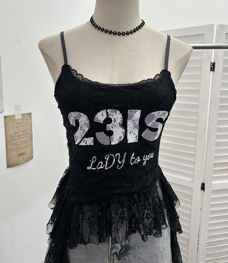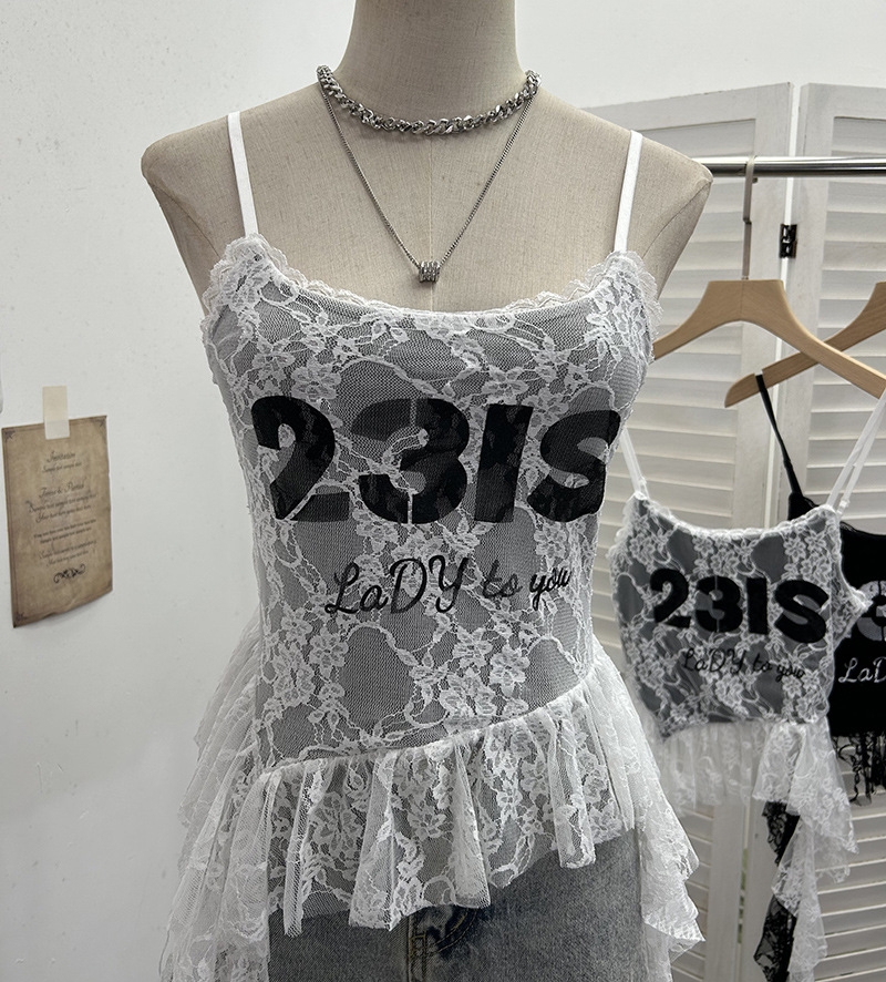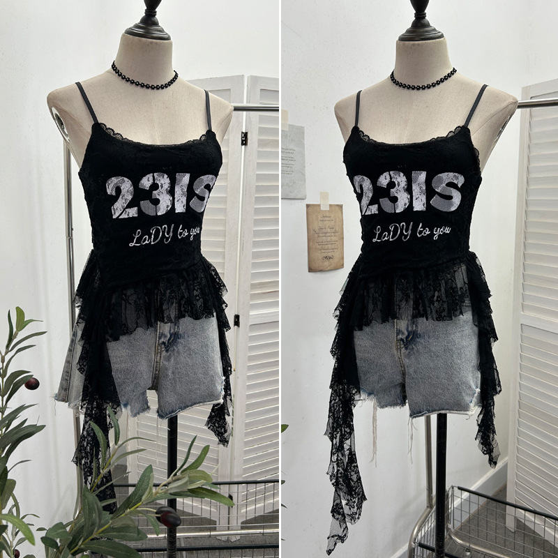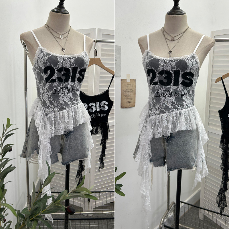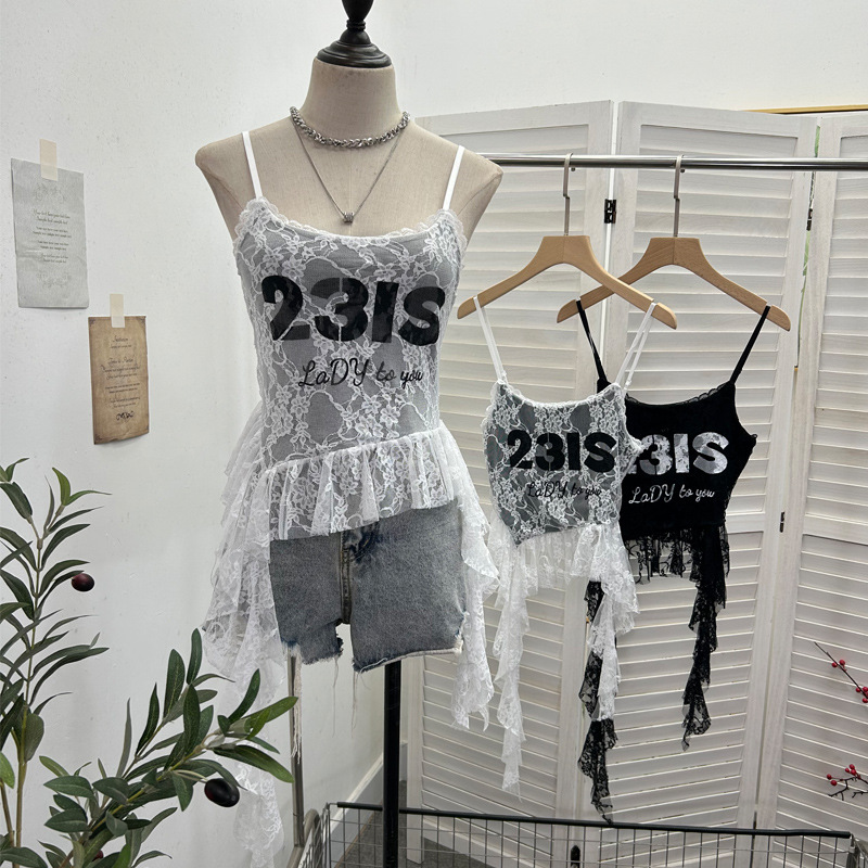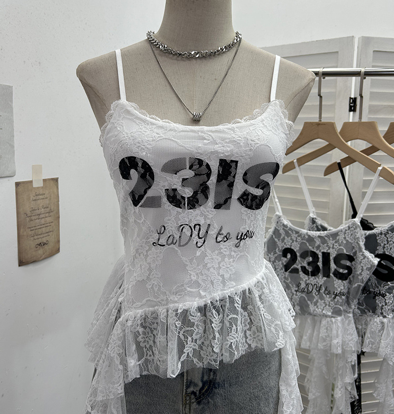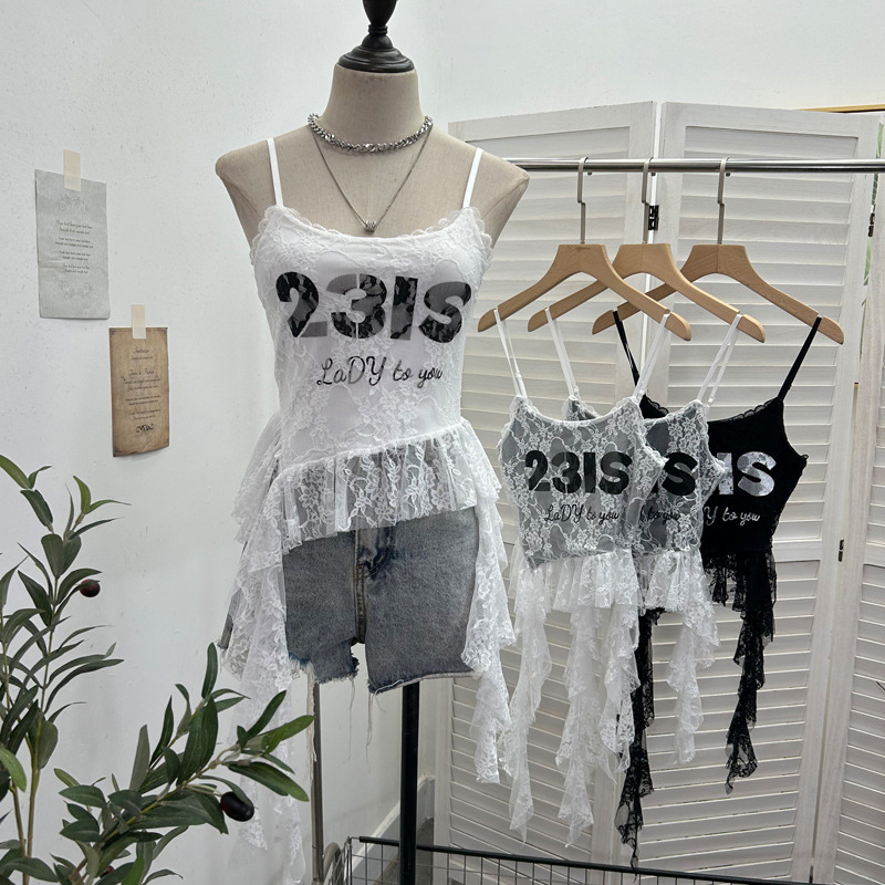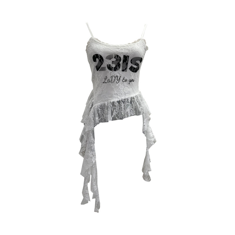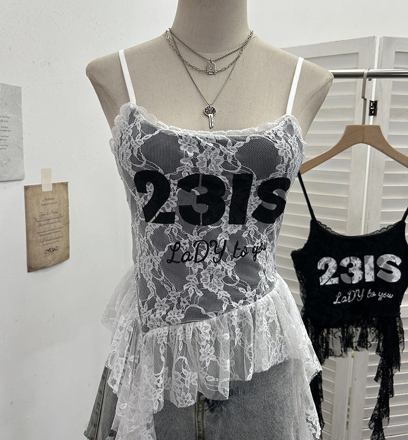 Uveng Real Shooting Lace Sling Vest Irregular Ribbon Hot Wear Print Short-Sleeved Top 1193