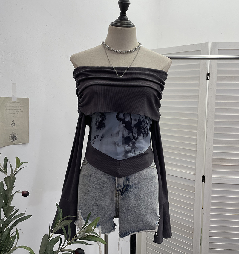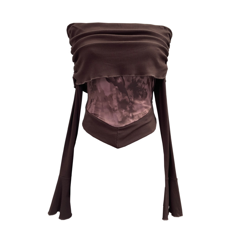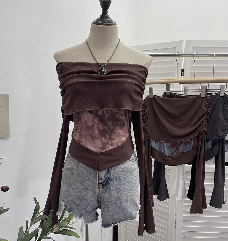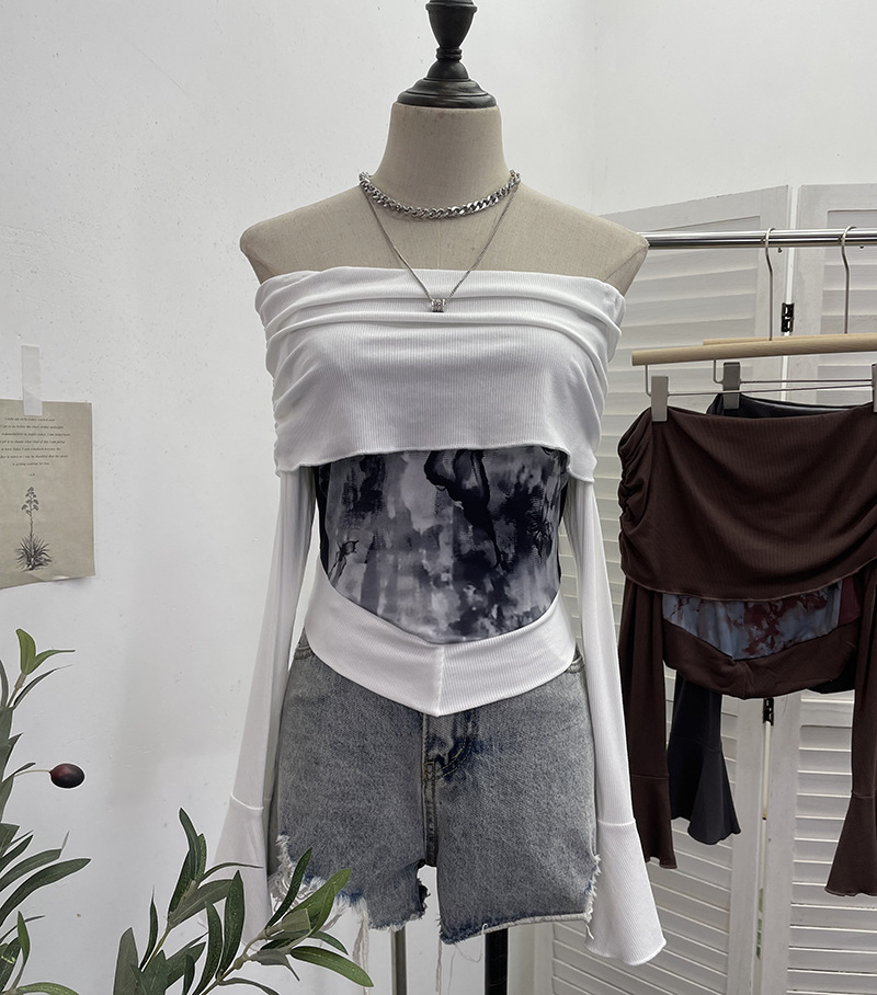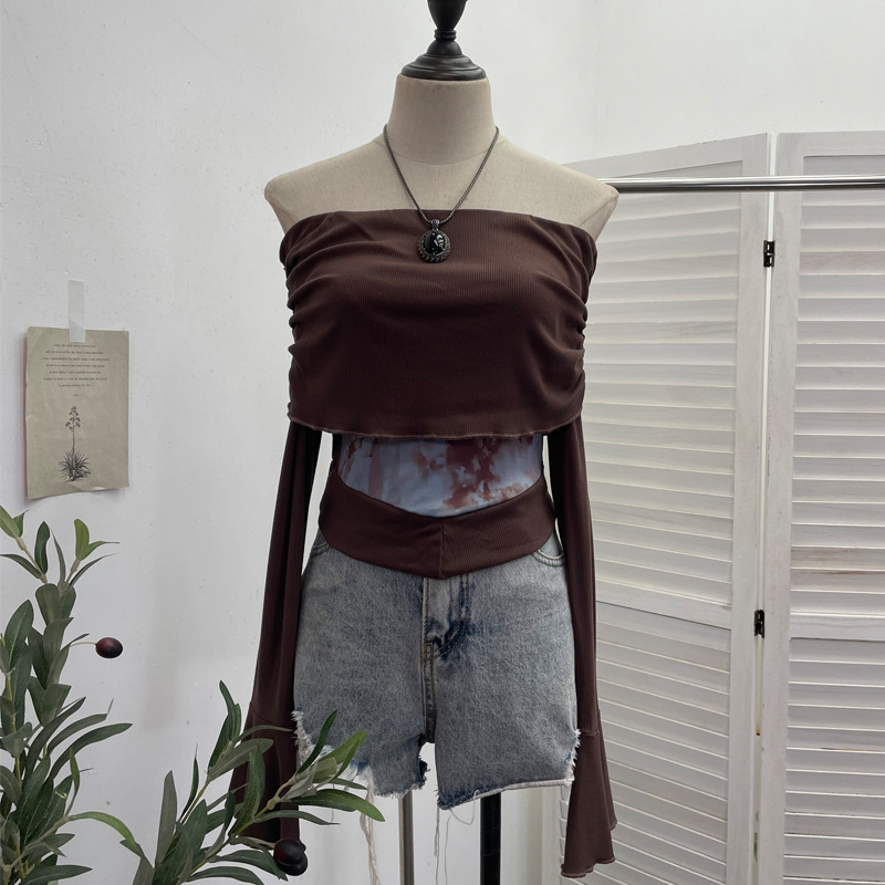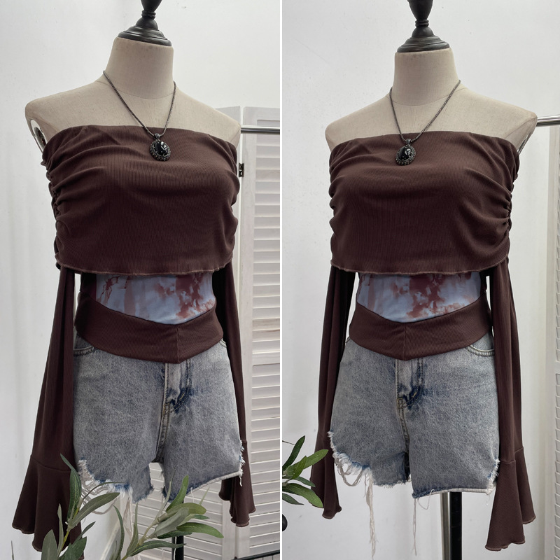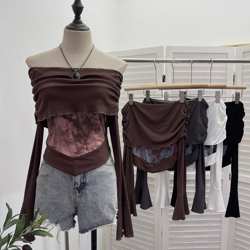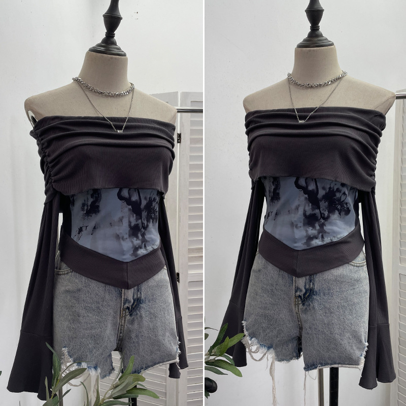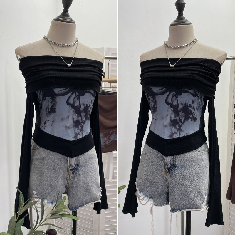 Uveng Real Shooting Maillard Wasteland Wind Word Shoulder Long-Sleeved Top Print Spliced Knitted Horn Sleeve Short T-Shirt 2663