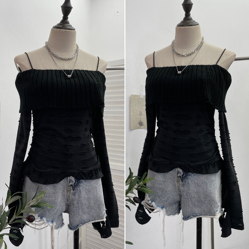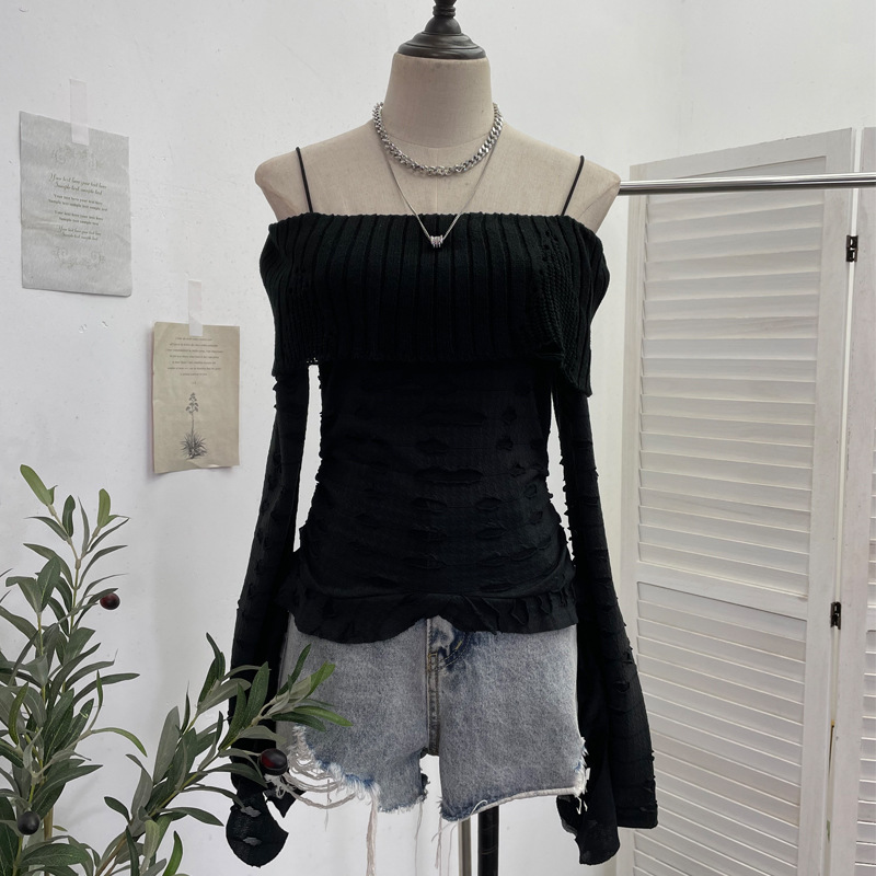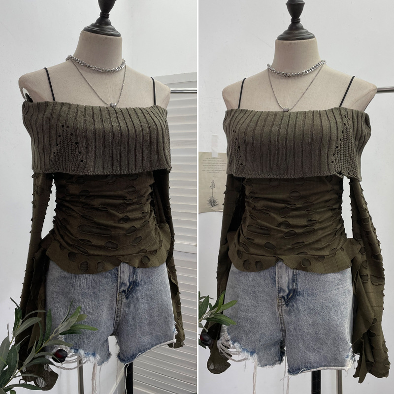 Uveng Real Shooting Of Waste Soil Wind Word Leakage Collar Collar Collar To Make Old Hole Sling Knitted Shirt With Short Sweater 1113