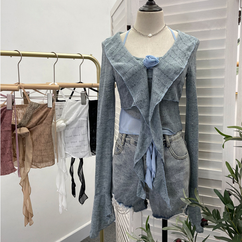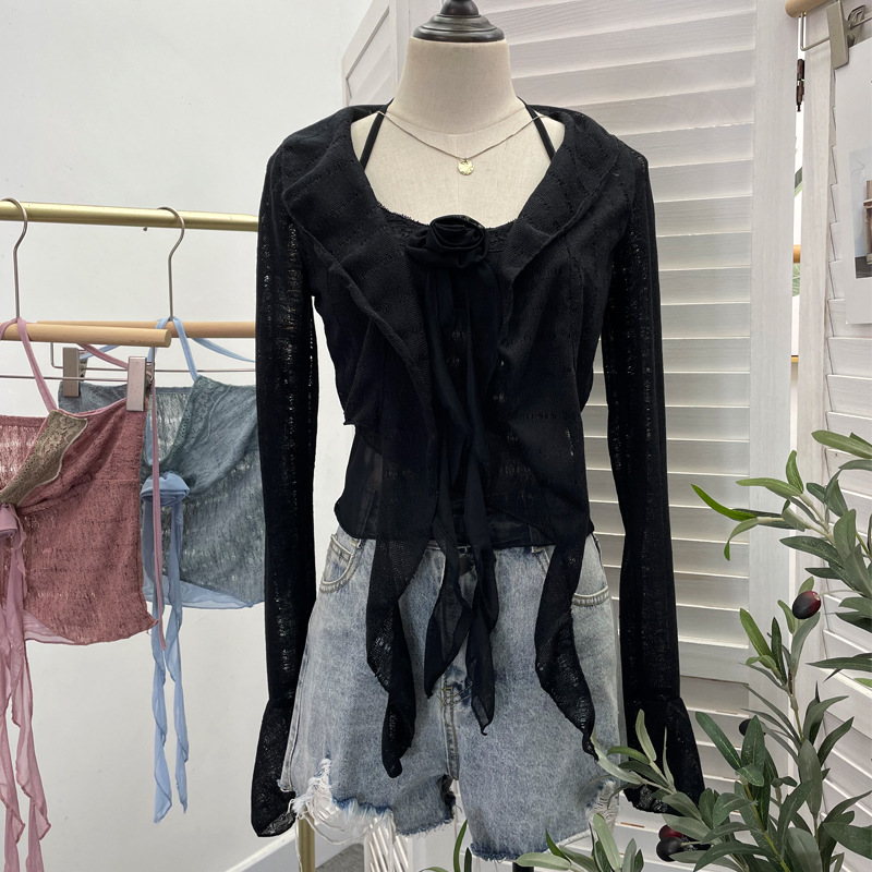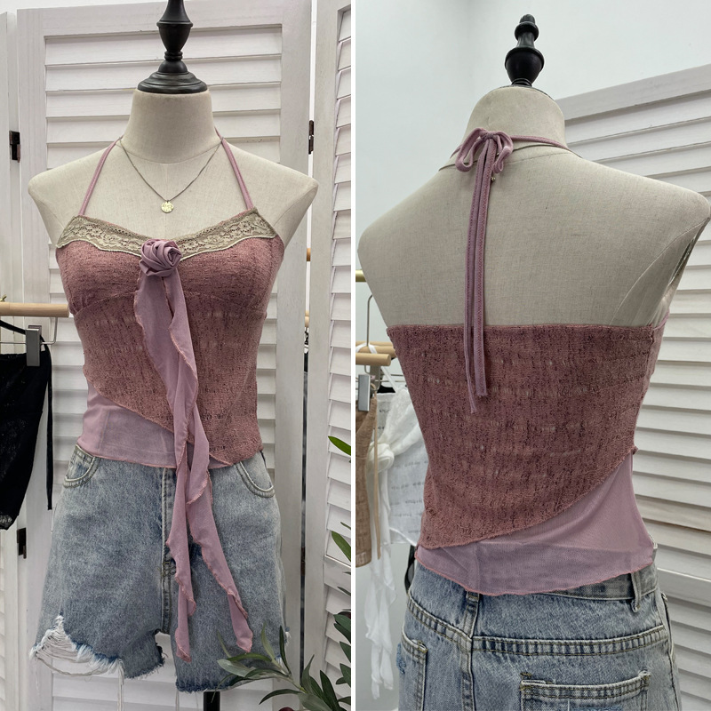 Uveng Real Shooting Pure Lust Style Set Hanging Neck Lace Hollow Sling Sling Vest + Short Lotus Leaf Side Shirt 88968