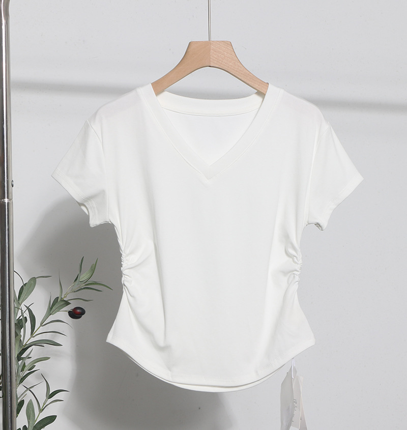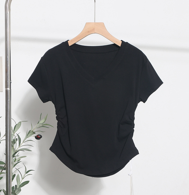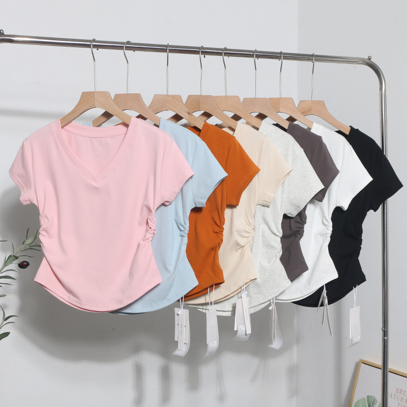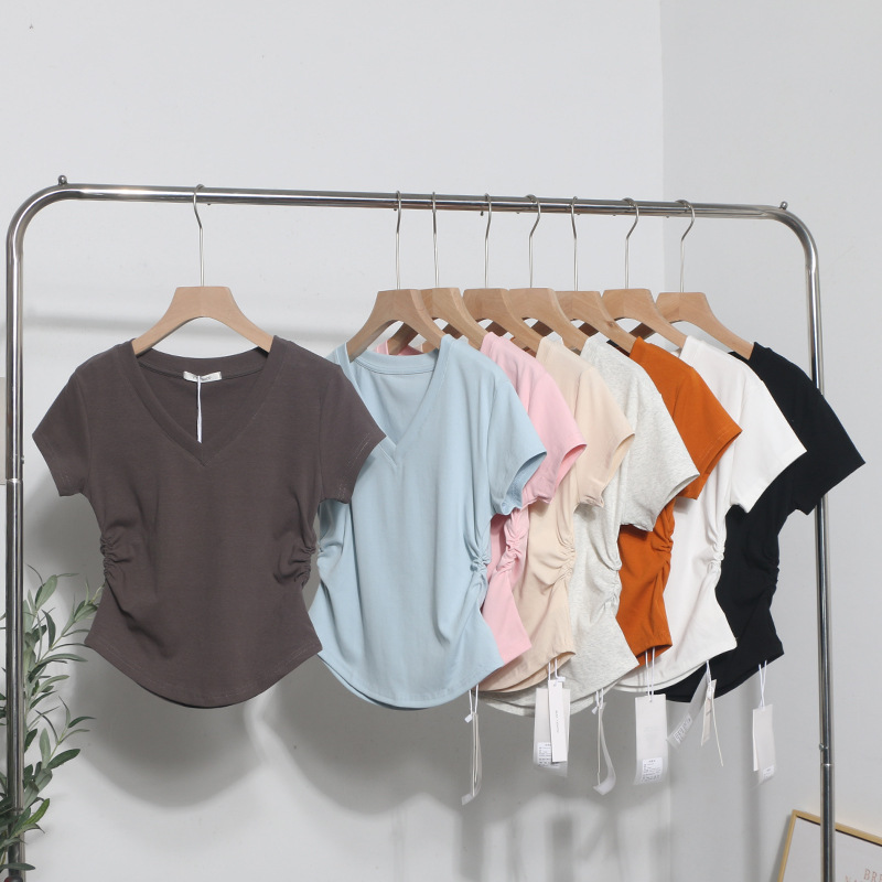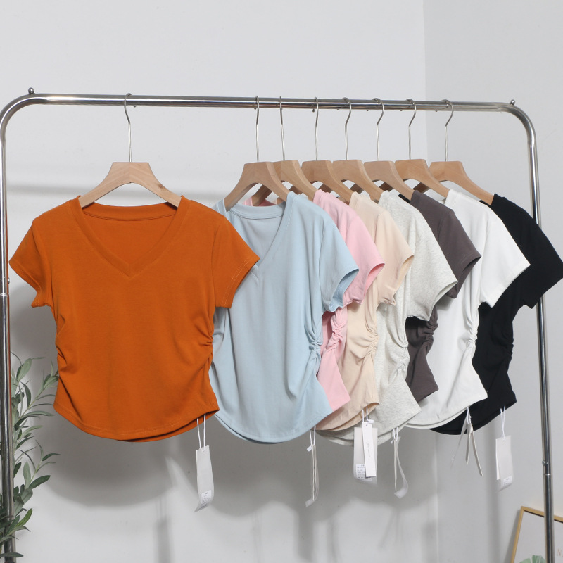 Uveng Recommended For The Summer V-Neck Front Shoulder Short-Sleeved T-Shirt For Girls Slimming Hottie Drawstring Irregular Top 2899