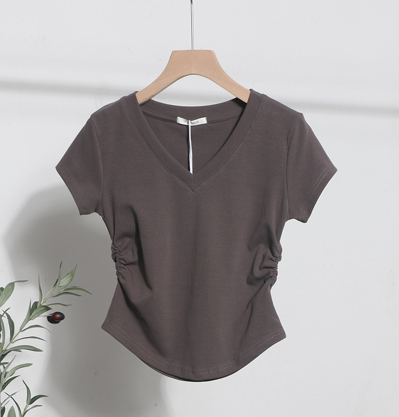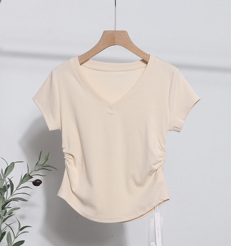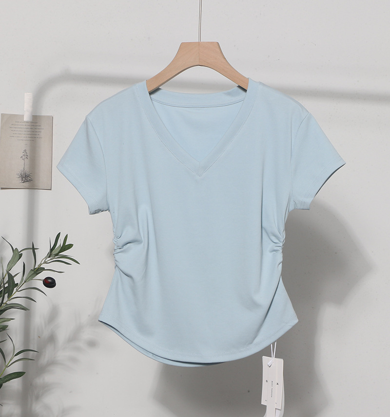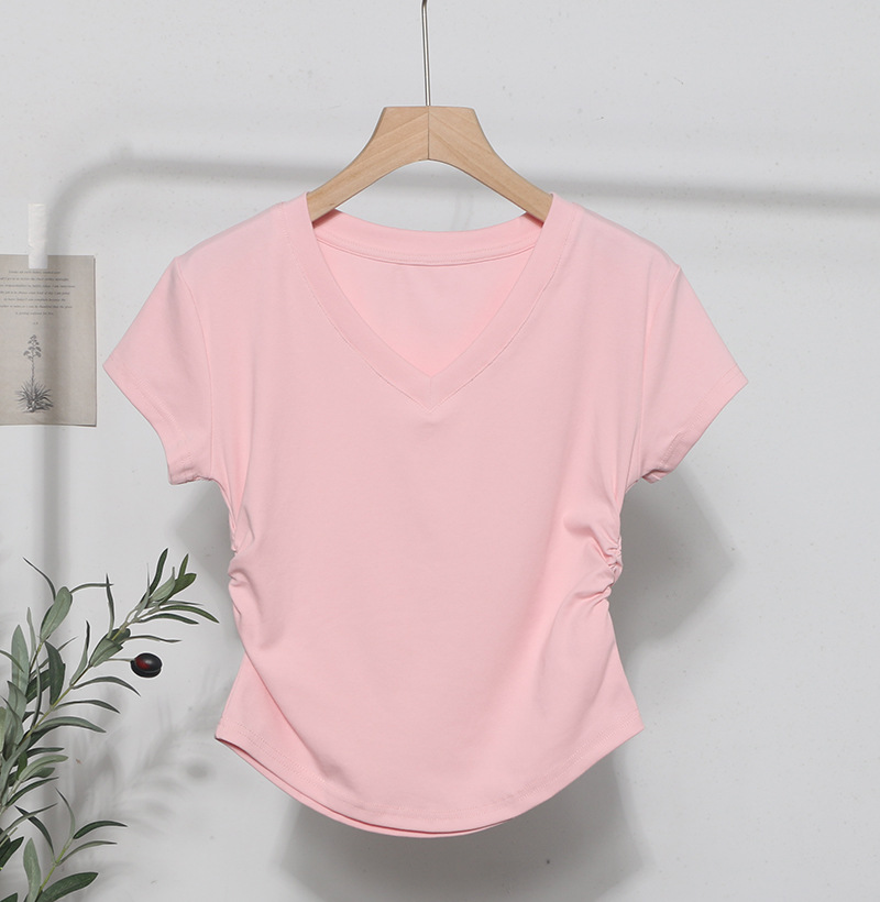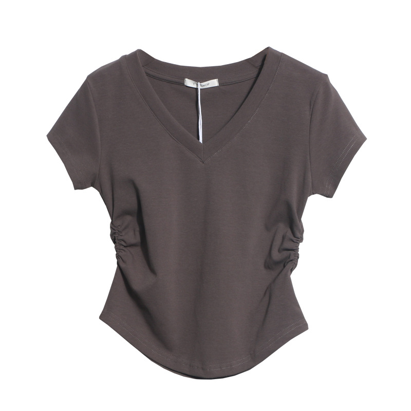 Uveng Recommended For The Summer V-Neck Front Shoulder Short-Sleeved T-Shirt For Girls Slimming Hottie Drawstring Irregular Top 2899