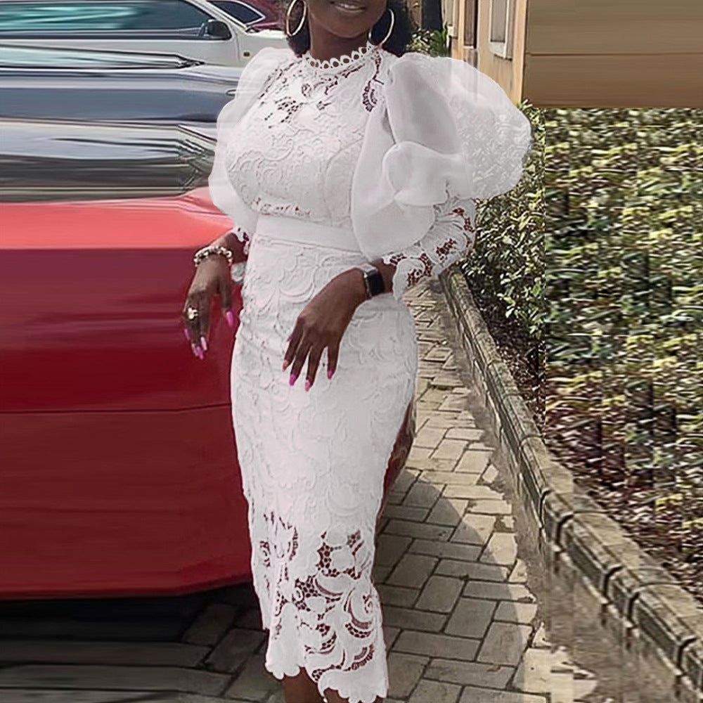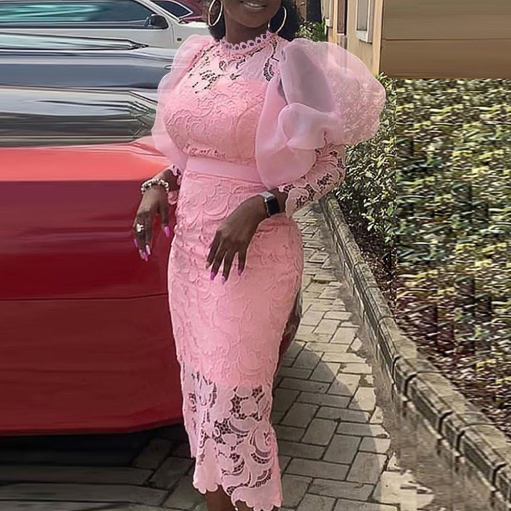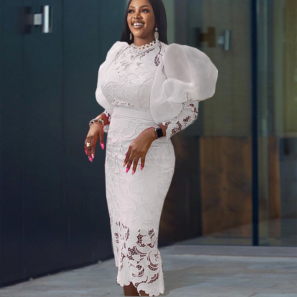 Women's Round Neck Lace Basic Model Puff Sleeve Three-quarter Slim-fit Party Dress