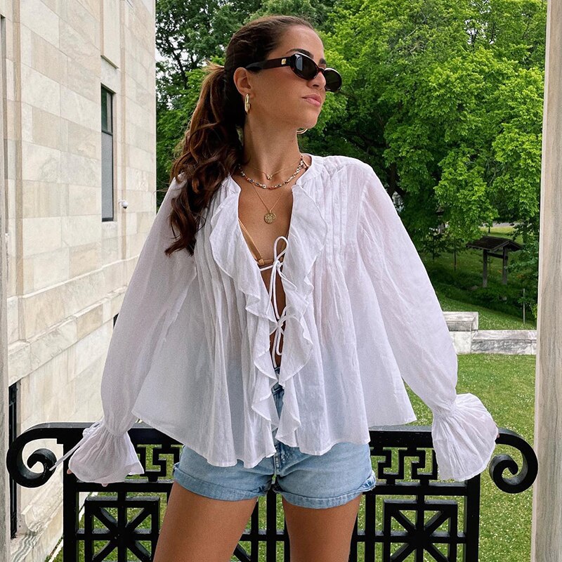 Uveng Ruffles Tie Up Blouse Shirts Women V Neck White 2025 Summer Elegant Long Sleeve Top Shirt Casual Sexy Fashion Vintage 413-0