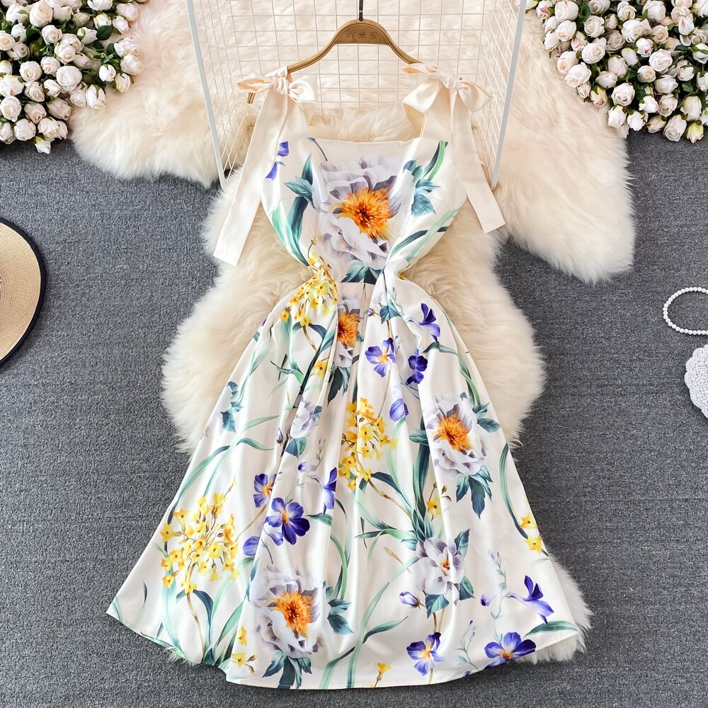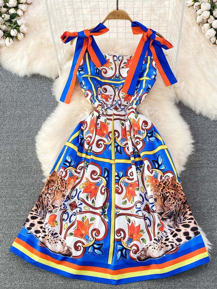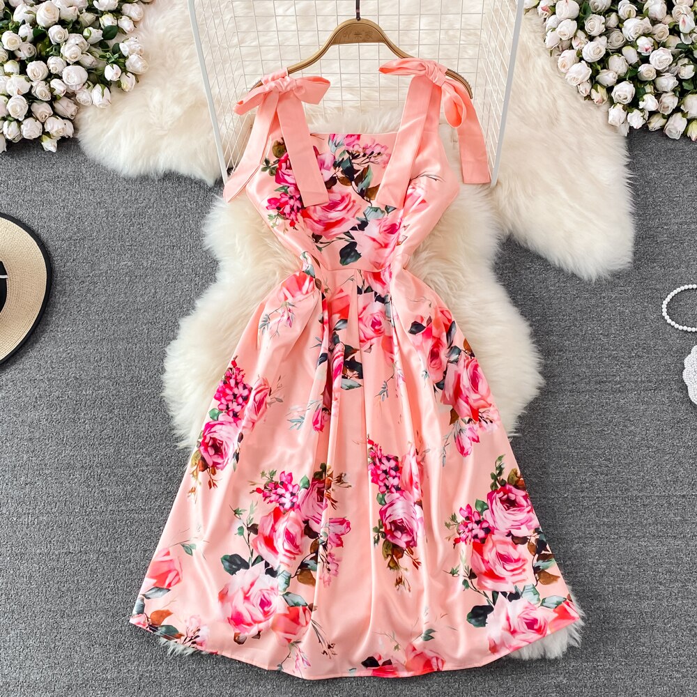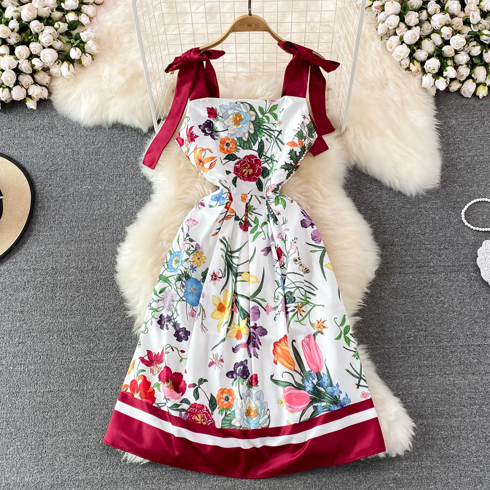 Uveng Runway Summer Bow Tank Dress 2025 New Women's Spaghetti Strap Backless Palace Floral Print Holiday Beach Dress N66878 413-0