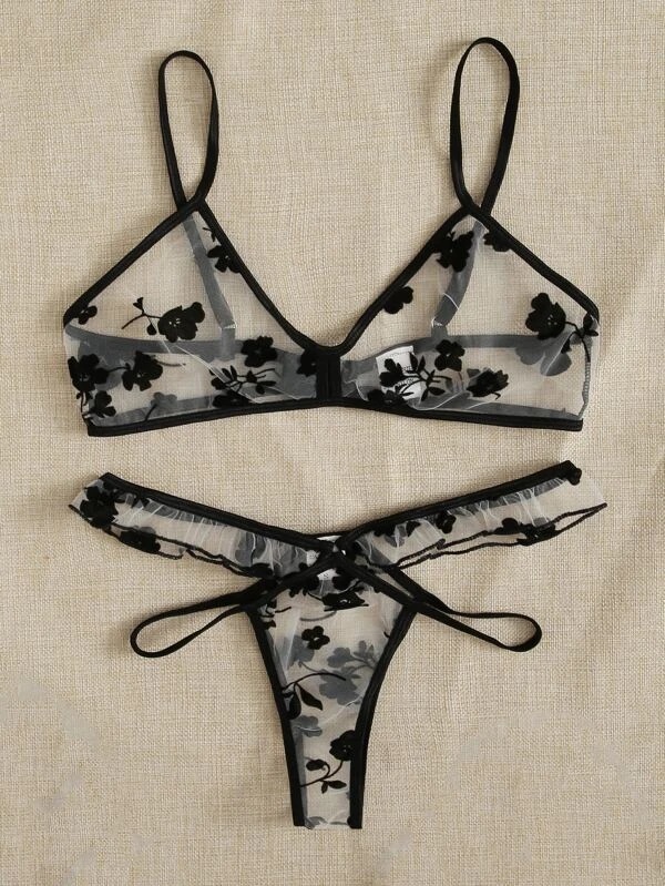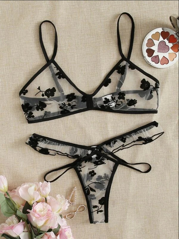 Uveng Sex Lingerie Sexy Women's Net Embroidery Perspective Three-Point Lingerie Set