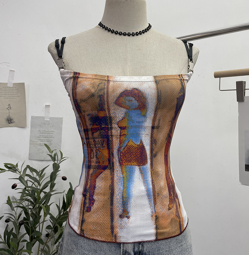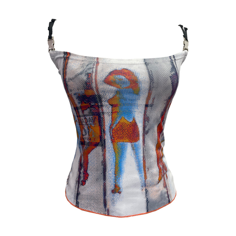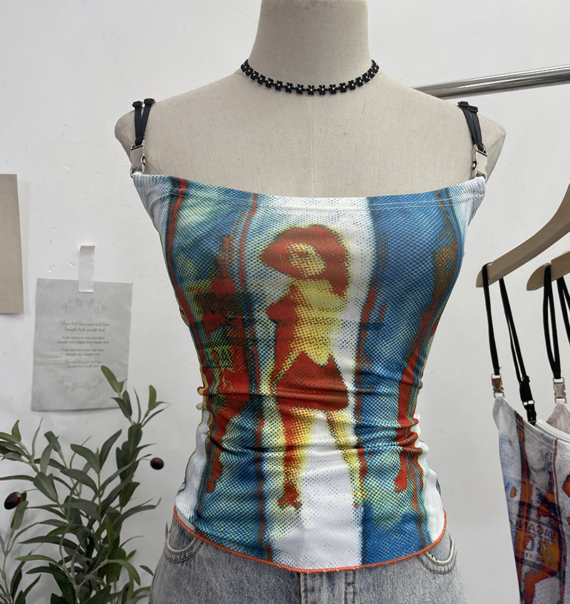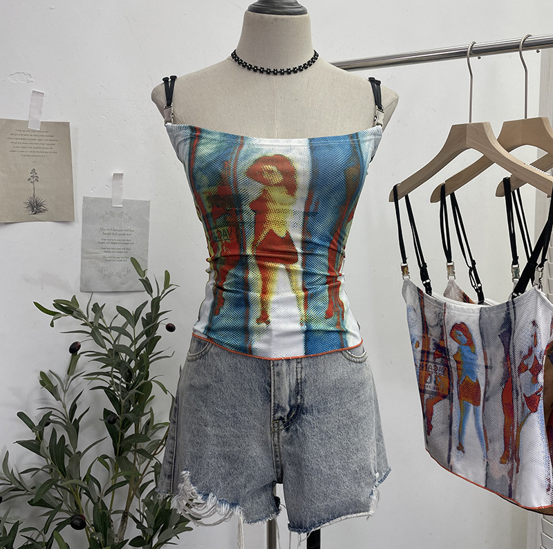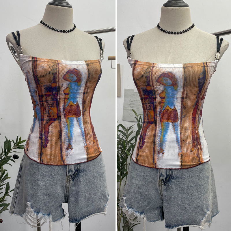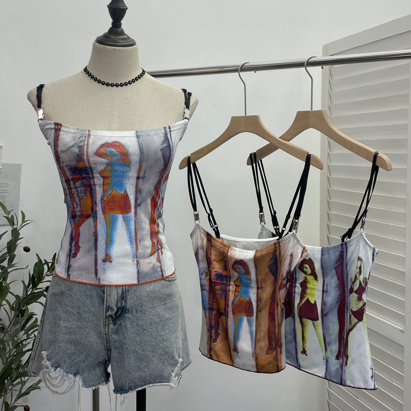 Uveng Sexy Hottie Shoulder Strap Small Print Slimming Sling Vest Short Sleeveless Top 8830